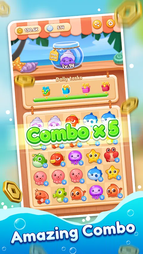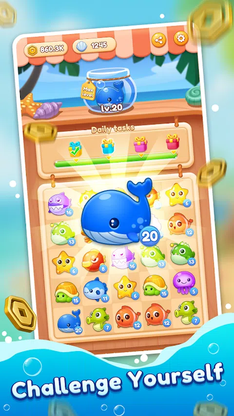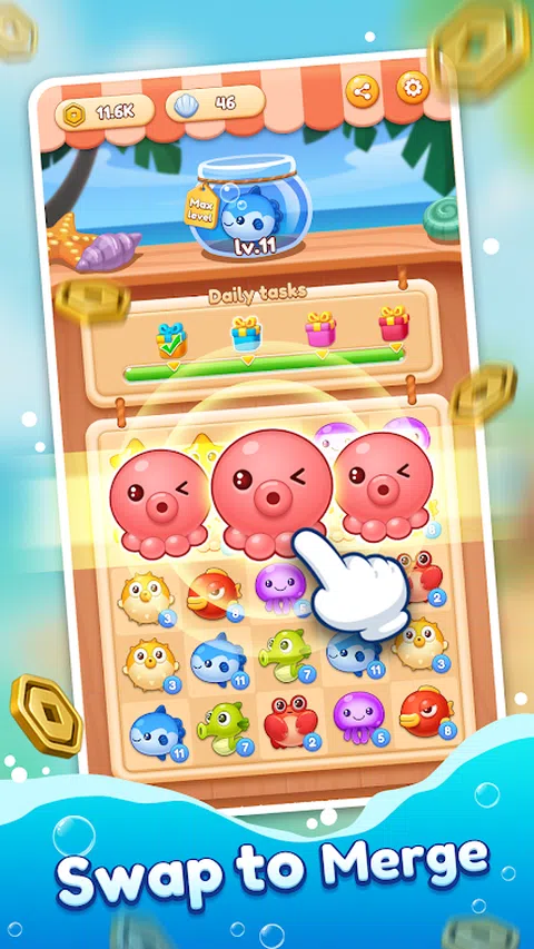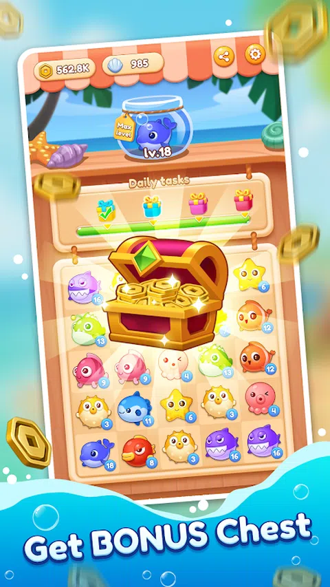 您是否厌倦了传统的合并游戏? 尝试海洋合并!一个有趣的海洋合并 3 游戏! 简单但超级上瘾。只需交换位置以将 3 个匹配的海洋生物组合在一起,它们就会升级到下一个级别。 ? 特点: ?惊人的海洋生物和醒目的合并效果? ✓图形和效果非常棒。 ✓匹配 3 个相同的动物,享受合并的乐趣! ?许多活泼的海洋动物? ✓每只动物都被设计得很可爱。 ✓经典但令人上瘾的合并 3 游戏永远不会让您感到无聊! ?大脑和压力缓解? ✓有趣的合并。 ✓合并的组合确实可以缓解压力。 ?与您的朋友分享? ✓邀请朋友,与他们竞争得分。 ? 大量奖励? ✓组合宝箱,幸运旋转,新级别奖励。 ✓只需进行 3 次合并即可赢得全部