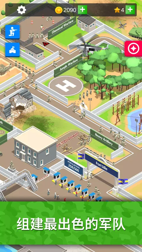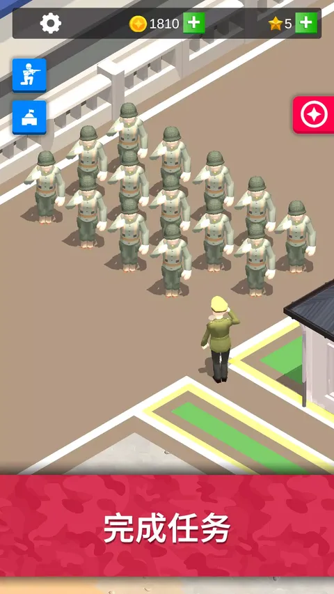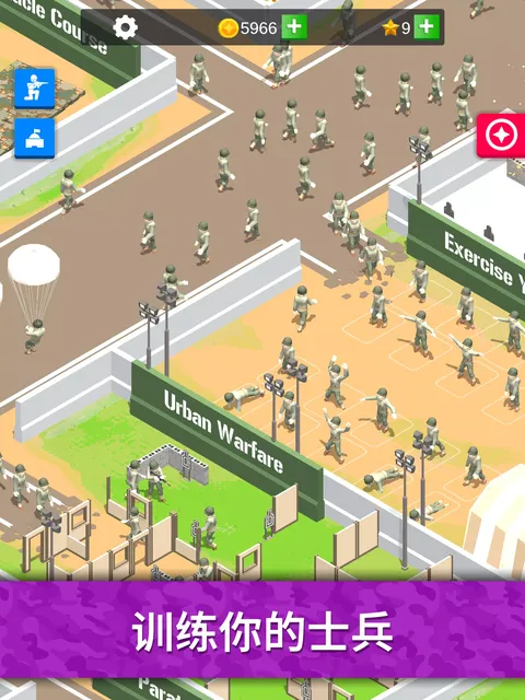创造世界上最伟大的军事基地!你将以二等兵身份从军队训练营起步,但没有时间发呆。因为你将经受各种考验,完成一系列训练挑战,从而顺利毕业,为世界各地的军事行动做好准备!随着基地中的军事训练逐步进展,你将获得金钱并扩张营地。你可以升级所有训练区的数值、速度、容量和队列规模。虽然过程如同过山车般起伏跌宕,但懒惰的学员必将遭到淘汰你会爱上发展和升级你的军事基地。以下是你在毕业前必须完成的一些挑战:运动场 - 前往运动场,通过仰卧起坐和跳跃运动等练习提高心率,保持强健的体魄。城市战 - 挨家挨户进行特警训练时,务必保持警惕。 丛林战 - 踏出直升机,观察四周,然后沿着绳索深入丛林,准备开展一场冒险。北极战 - 控制心跳,保持温暖,躲避雪崩,直奔北极苔原。重型机关枪 - 一边训练,一边倾听重型机关枪哒哒哒哒。重型火炮 - 轰轰轰,是时候让大炮创造人间地狱了。化学战 - 戴上面具,谨慎呼吸,注意脚下。在气体迷雾中找到自己的出路。坦克军团 - 汉子(和女汉子)专用,驾驶坦克发射大炮,造成惊人伤害。大杀四方!沙漠战 - 天气超级超级超级热,并且砂砾无比沉重。所以你必须在木板上开车。