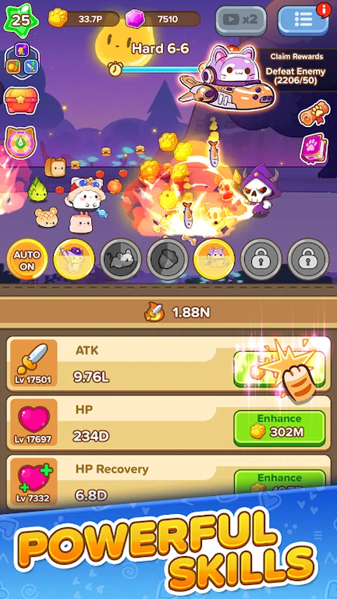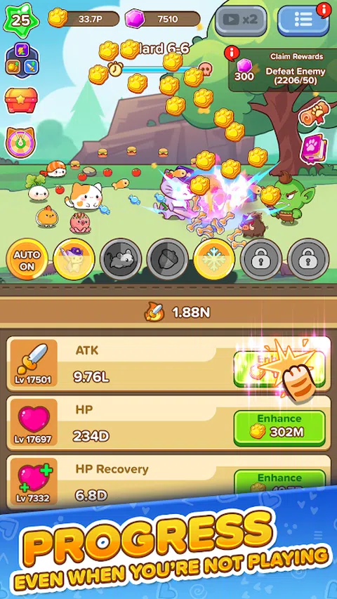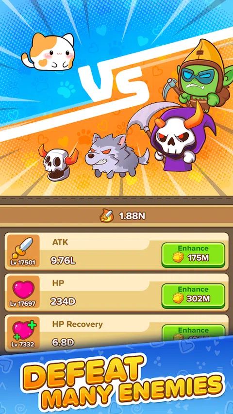 猫失去了主人,寻找家园的旅程将是什么?作为猫咪的领导者,在这个在线角色扮演游戏中完成你的任务,来帮助它们找到自己的甜蜜家园。 猫冒险:空闲角色扮演游戏是一款动作角色扮演游戏。这是一款角色扮演游戏,同时具有竞技场和在线闲置 RPG 游戏元素。该游戏提供了出色的物品系统,数百种武器,防御分为几个不同的级别。 带有闲置点击游戏的自动战斗系统使您能够不断赚取更多硬币,以提高猫的攻击、血液、恢复、攻击速度和经验获取效率,这使您的冒险更加轻松。在这个免费的角色扮演游戏中打一场闲散的战争,享受最佳的移动游戏。 角色扮演游戏冒险战斗 - 不要让任何怪物存活:击败所有怪物并粉碎他们的财物。 - 冒险时间:成为一只冒险猫,在地牢中寻找宝藏。 - 粉碎敌人,击败首领,赚取黄金,并与您的猫一起掠夺!杀死你遇到的每一个怪物! 角色扮演游戏进度和策略 - 令人兴奋的奇幻冒险中的空闲角色扮演游戏在线游戏! - 升级您的同伴和猫以进行战斗游戏。 - 随心所欲地合并和自定义您的猫。 - 使用武器、盔甲、耳环、戒指和玩具增强猫的力量,在战斗中获得优势。 - 通过组合攻击者、武器和控制怪物来设置您的战斗策略。谁将成为孤独的幸存者?准备战斗,带领你的猫投入战争! 空闲自动战斗 - 设置你的英雄阵容,他们会自动为你而战