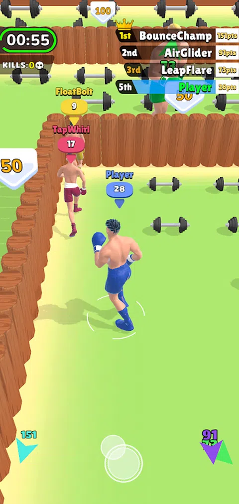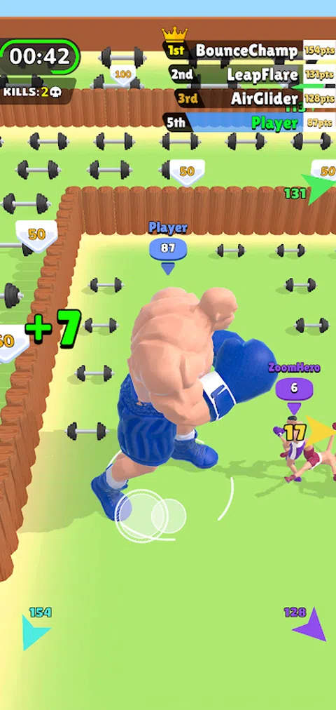 你可以通过拿起哑铃来增强自己。 当你比敌人强大时,你可以击败他们。 当您击败敌人时,您将获得他们的等级并可以增强自己。 目标是及时变得比任何人都强大