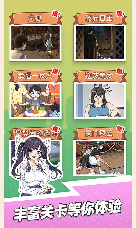 一款极具特色的休闲解压小游戏。游戏主要分为三个大的模式。每个模式内含多个关卡,来配合有不同的玩法。游戏分剧情模式、文字逃脱和编剧模式。剧情模式丰富内容,微恐有趣、找茬解压、感人故事等,而文字逃脱更多是要玩家通过不断探索解开谜题,逃出密室。编剧模式则给玩家上帝视角让玩家安排故事的走向,通这些给玩家新颖丰富的游戏感受。