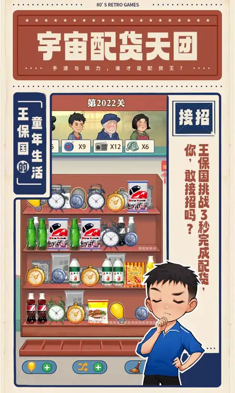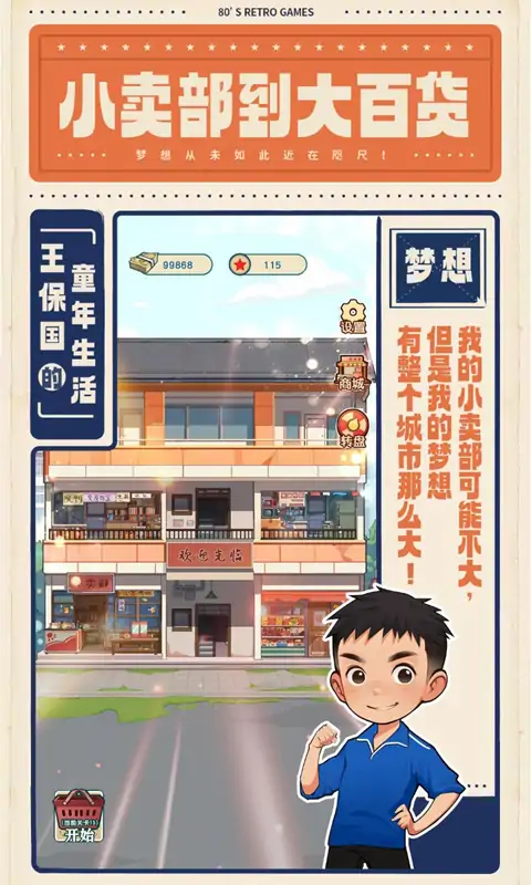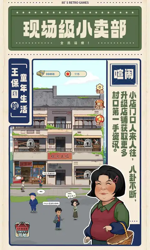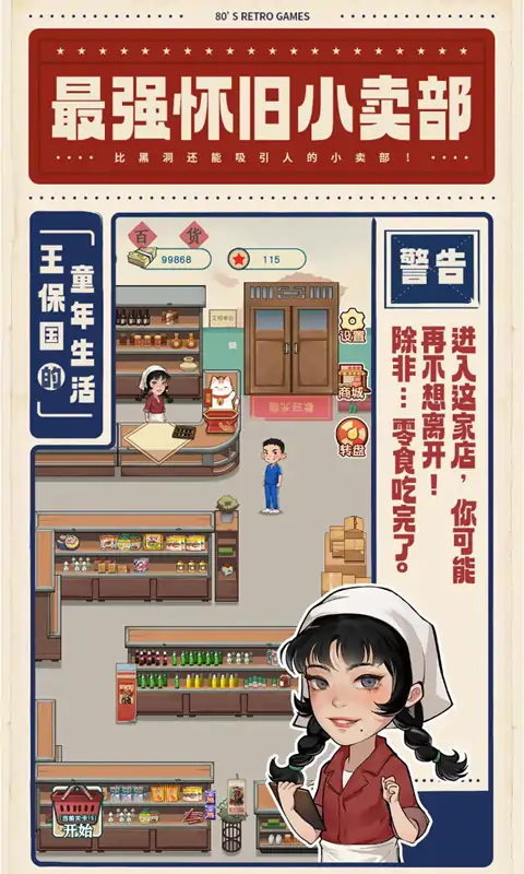 《王保国的童年生活》是一款富有怀旧气息的休闲游戏,在游戏中,玩家扮演王保国和家人一起经营家族小卖部,随着玩家一步步的经营累积,小卖部柜台越来越多,店内装饰也将变得越来越高级。并且小楼还会发展出其他的分部,提供街坊邻居日常生活中的各种商品,随着游戏的推进不断出现各种物品是否会让你与王保国一起,回忆起儿时的点点滴滴呢?