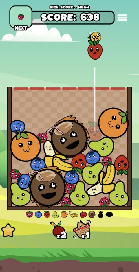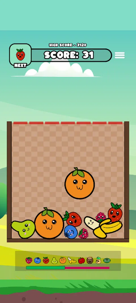 在这个基于物理原理的匹配 suika 游戏中匹配形状奇特的水果。 在组合水果以创建新的更大的水果时击败您的高分,组合的水果越大,您获得的积分就越多。赚取积分将解锁一次,使用道具让您继续玩。 不过要小心,如果你的水果从篮子里出来,你只有 10 秒钟的时间在游戏结束前纠正它