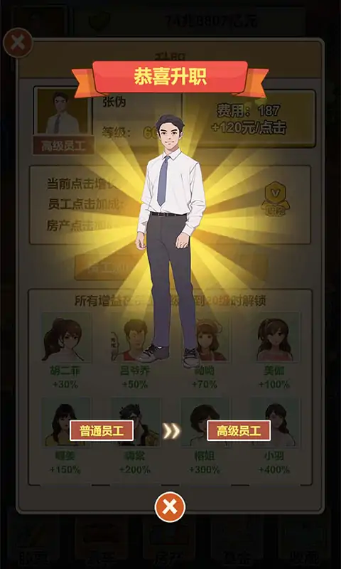 你想成为商业大佬嘛,动动手指就能体验到商业帝国的建立。我们有优秀的团队,和多元化的理财方式:招募员工,升职加薪、豪车投资、房产收购、基金管理、宝物收藏,致富之路任你选择。快来创建属于你的商业精英团队,利用你的投资眼光,一步步成为商业巨鳄吧。