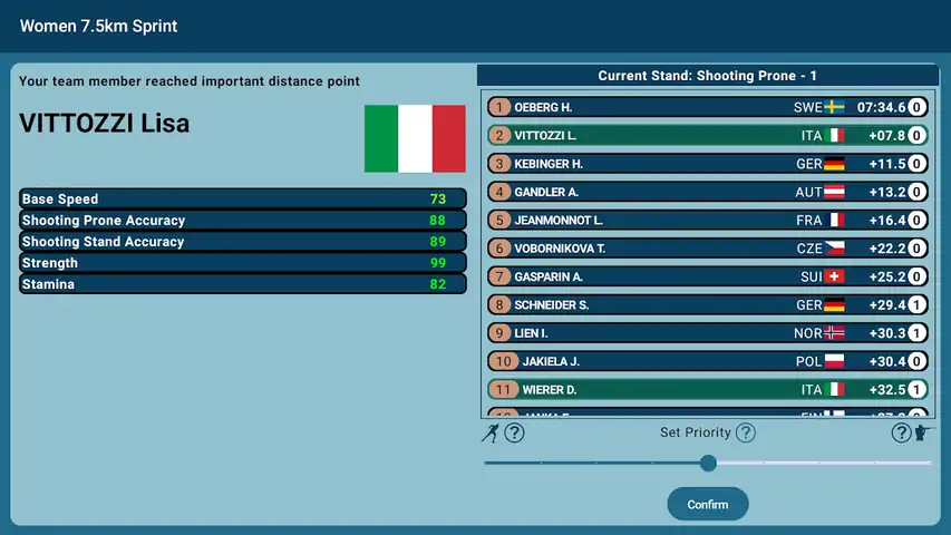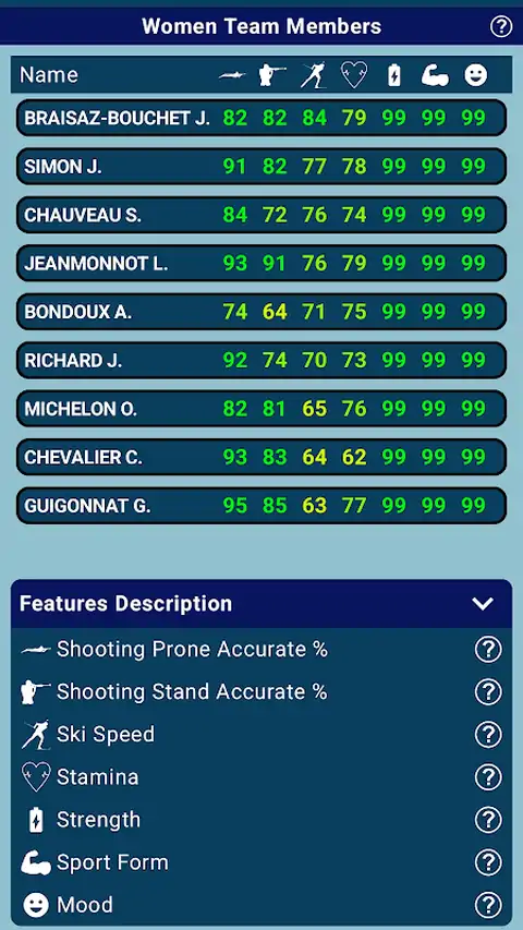 冬季两项主教练游戏允许你管理你的团队并决定一切:训练优先级,团队烘焙师选择,比赛个人指导等等。 选择您的冬季两项团队,您将成为主教练或经理。将可以管理: 1)团队培训 - 决定哪些技能应该比其他人更需要提高:射击准确性、滑雪速度或耐力。 2)选择比赛的阵容或名单 3)比赛中每位运动员的优先事项和个人指导 冬季两项主教练拥有游戏引擎,可以像在电视节目中一样查看每场比赛:当前的主赛事始终在前面,可以查看当前的积分榜和团队成员的状态