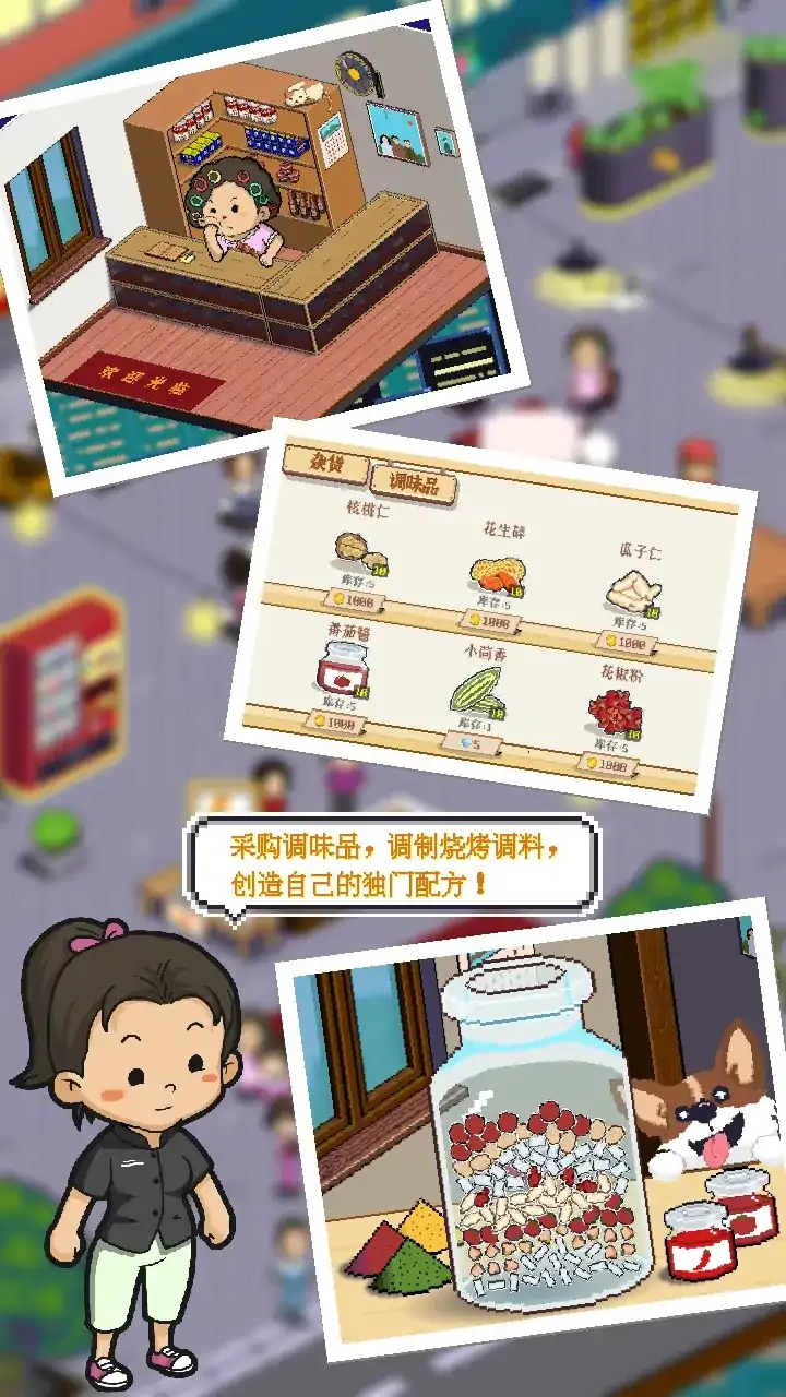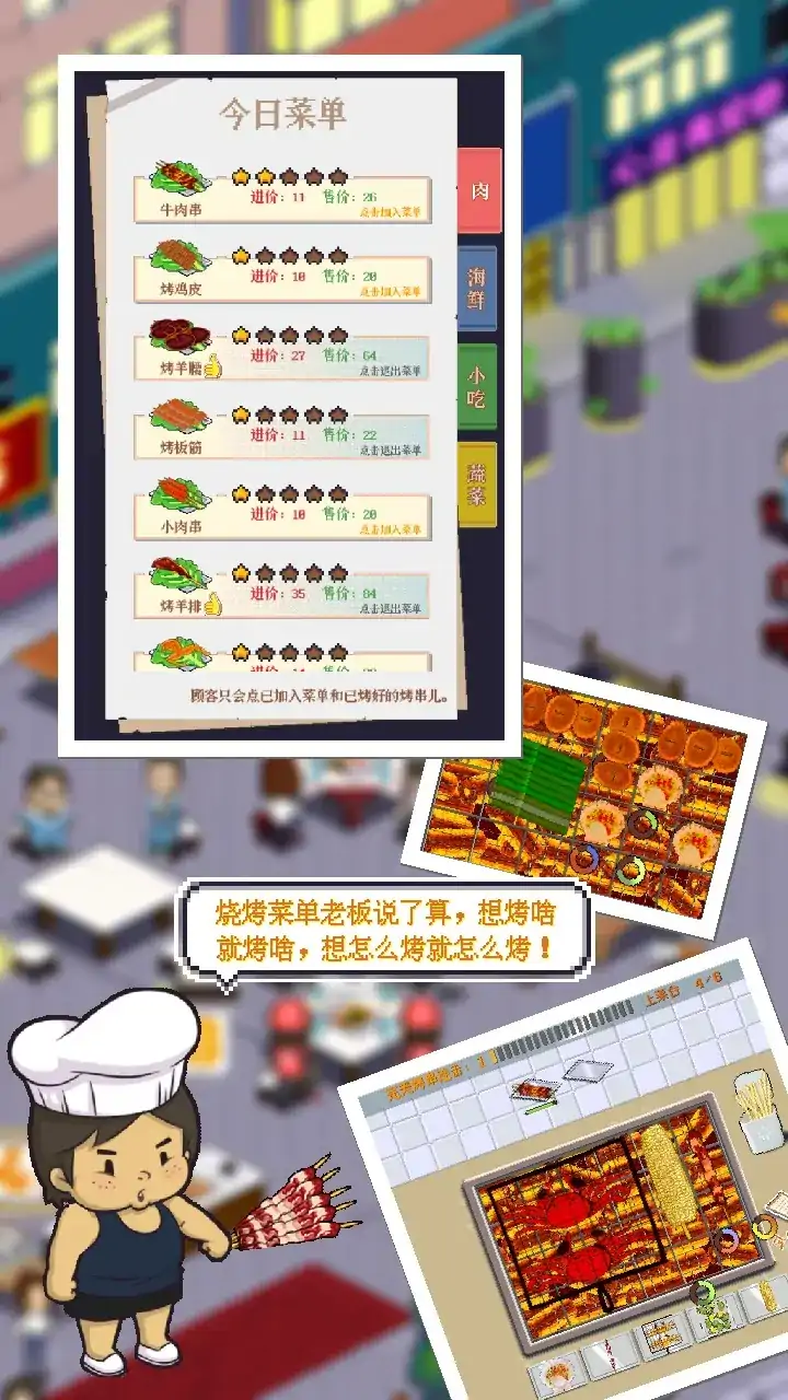 在不那么繁华的小城,开一家属于自己的烧烤店。自己制定菜单;自己调配调料;自己决定店铺的装潢。可以雇佣员工负责店内的各项工作,自己忙里偷闲听听顾客们闲话家常。休闲、简单且有趣的放置经营小游戏。 【游戏特色】 ♞店铺经营,真实模拟 小店虽小,但是琐碎不少。作为老板的你要合理的制定菜谱、购买设备、雇佣员工、装饰环境等等。 ♞手动烧烤,丰富乐趣 虽然是老板,但是烧烤的手艺不能丢。各种不同的食材,烧烤的火候不同,烤糊了可是拿不到完美奖励的! ♞雇佣员工,解放双手 前期资金紧张的你,虽然身为老板,但是也得端茶送菜,有了员工才能统筹全局! ♞收集菜品,个性菜谱 小店新开张,食材不多,得要老板亲自收集,才能定制个性菜谱! ♞调料制作,口味提升 调料是烧烤的灵魂,想要赚钱多,那么制作秘制调料是不可少,但是调料的素材,可是要老板自己收集购买的! ♞购买设备,扩大经营 想要做大做强,升级旧设备,购买新设备是必不可少,但是要买哪个就看老板你自己喽!