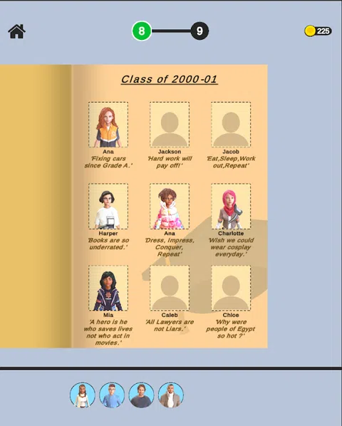 点击以阅读学生信息并将其与年鉴中的引用相匹配。 根据此信息将正确的学生照片拖放到年鉴中