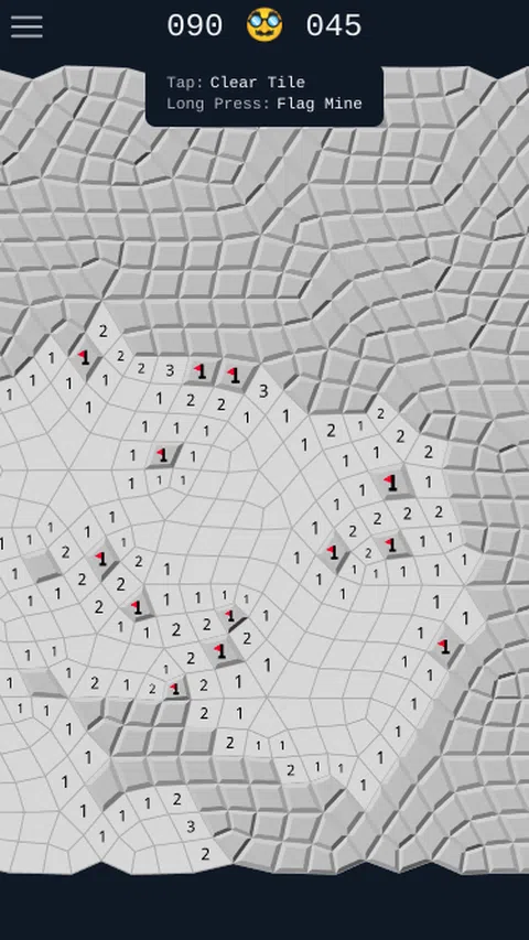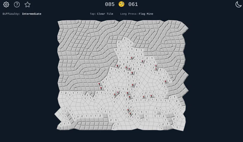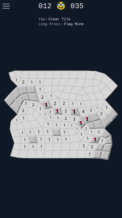 扫雷是一款益智游戏,您需要在由图块组成的网格上标记所有地雷。数字为您提供有关单元格周围地雷数量的线索,您需要使用演绎和逻辑来找到哪个图块上有地雷。 错误地发现一个地雷,您就输了。标记所有地雷,或揭开所有免费图块,您就赢了。 这个版本的扫雷有一个扭曲,网格是不规则的。在常规网格上,每个单元格始终有 8 个邻居,但在这种情况下,它们可以有 6 到 10 个。这会导致游戏更加困难,因为您无法构建相同的心理技巧来解决地雷所在的位置。 这是一款让您时刻保持警惕的游戏