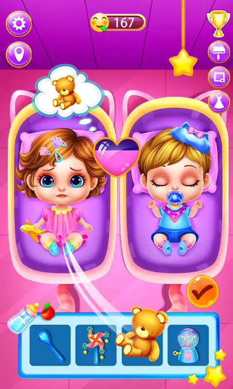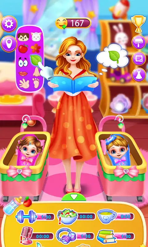 恭喜!新手孕妇妈妈马上就要生下一对双胞胎了,我们要带她去医院进行检查,照顾宝宝和妈妈的健康。 孕期检查: 1. 用心电图检查宝宝健康状况 2. 探听宝宝的心跳 3. 顺利通过唐筛,宝宝非常健康 4. 使用婴儿检测器检测婴儿,第一次胎动 5. 测试妈妈血糖指标,一切正常 6. 控制孕妇的体重和宝宝的体重 日常活动: 1. 给宝宝换尿布,洗澡,保持婴儿身体的清爽 2. 冲泡奶粉,喂养宝宝 3. 和宝宝进行互动玩耍,让宝宝感到开心,哄宝宝睡觉 4. 妈妈要每天保持运动,有一个健康的身体 5. 每天保持健康的饮食,制作健康的蔬菜食品和饮料 6. 多进行娱乐活动,唱歌,绘画,阅读,拼图等,保持心情愉快 换装打扮: 1. 为房间进行装扮,换家具,装饰物等,装饰一个温馨的小屋 2. 为妈妈进行梳妆打扮,换上好看的衣服、鞋子和帽子等 3. 给双胞胎宝宝进行换装,穿上可爱的衣服和配饰。 特点: 1. 定期为孕妇妈妈做检查,注意身体状况 2. 房间布置设计 3. 给妈妈进行换装打扮,穿上好看的衣服、配饰等 4. 为宝宝换尿布,冲奶粉,进行打扮 5. 多进行一些娱乐活动,保持心情愉悦