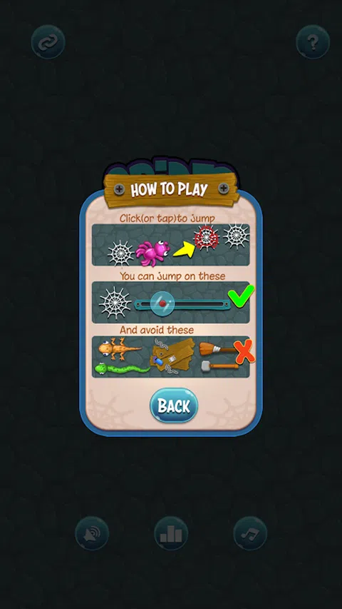在这个令人上瘾的休闲游戏中,帮助小蜘蛛尽可能地跳得更远! 蜘蛛跳跃游戏简单易学,易于玩耍,特别是帮助孩子学习自然反射,掌握难度很大,但对所有年龄段的人都很有趣! 只需点击网页和滑块。尽量避开蛇、蜥蜴、锤子、扫帚和树林,因为它们会使你的蜘蛛死亡。 尝试我们的游戏时,您可以获得什么? - 免费下载,游戏内无广告。 - 无尽的游戏模式和无限的重玩。 - 炫酷的艺术。 - 美妙的音乐。 玩得开心