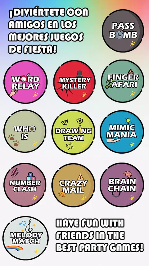 一个应用程序中包含 12 款令人兴奋的游戏,让您的派对和聚会的乐趣提升到另一个层次!召集您的朋友并准备好开怀大笑,这一切都可以通过一个设备的便利实现。准备好享受终极团体乐趣了吗?探索能让您成为最佳主持人的游戏列表: • 传递炸弹:不要让炸弹在你手中爆炸,大声说出与所示主题相关的单词,将其传递给你的伙伴! • 手指探险:展示你的反应能力并记住正确的动物声音即可获胜。在其他人之前将手指从屏幕上移开! • 模仿狂热:仅使用基于临时卡片的哑剧来表达自己,并让团队的其他成员猜测以获得积分。 • 脑链:释放你的第六感,通过两个词将你的思维与其他玩家连接起来,赚取积分。剩下的人会想到什么相关的词? • 神秘杀手:在这款角色扮演游戏中生存,并在不同令人兴奋的游戏模式中发现伪装成村民的杀手。 • 抽签小组:以小组形式抽签,以便最后一名玩家能够正确猜出所显示的单词。不要让破坏破坏了这幅画! • 疯狂邮件:解密游戏中从第一个玩家到最后一个玩家连续发送的消息,其中短语的某些字母将替换为星号(*)。真是一场多么精彩的交易啊! • 单词接力:作为一个团队协作,共同定义屏幕上显示的单词(猜测的玩家除外)。团队中的每个玩家都可以说出一个单词来组成短语,循环定义该单词! • 谁是:以未知的方式投票给玩家作为妥协问题的答案。谁将获得最多选票? • 数字对决:在这场团队数字对战中展示您的心理和身体敏捷性,每个玩家都以数字表示。当你的号码被叫出时,通过重复按下你的球队按钮来与你的对手竞争以获得更多积分! • 旋律匹配:记住旋律顺序并按正确的顺序按下声音按钮即可获胜。坚持到最后不犯错误即可获胜! • 隐藏的故事:写下你自己的轶事或秘密,并以未知的方式聆听其余的故事。以小组形式投票,将故事与每个玩家联系起来,并尝试将您的故事与其他玩家联系起来以获胜