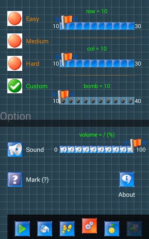 - 扫雷 HD 是一款基于经典扫雷游戏 PC 的益智游戏。玩扫雷HD将有助于提高你的逻辑思维并训练你的大脑。 - 游戏的目标是打开所有不包含地雷的方块。 怎么玩 = - 每个方块都可以通过按下来打开。有些方块是空白的,但有些方块包含数字 (1-8),每个方块 数字表示他们周围的地雷数量。当周围没有炸弹时,方块会自动打开。 - 长按一个方块可以改变它的状态(正常/标记/问题)。当您标记了数字方块周围的所有地雷后,您可以通过按数字方块来快速发现其周围的所有空方块。 - 如果你打开放有炸弹的方块,你就输了游戏。 - 当你打开没有炸弹的所有方块时,你就赢得了游戏。 特征 = - 第一个方块不会有炸弹。您可以随时开始新游戏。 - 评分基于炸弹的数量和密度。 - 四个难度级别:简单(10x10,10 个炸弹)、中等(10x20、40 个炸弹)、困难(20x20、100 个炸弹)、自定义。 - 迷你地图