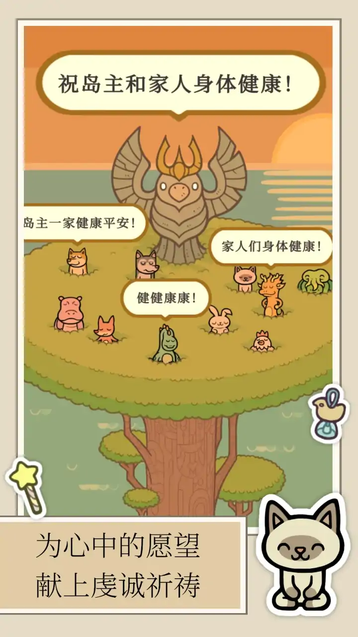 《许愿岛》是一个希望能给玩家带来陪伴感,并且对玩家的愿望予以支持和鼓励的游戏。在游戏中,玩家可以通过完成小任务来抽取到性格各异的“祈灵”,他们会虔诚的为玩家写下的愿望予以祈祷和祝福。 游戏中的时间和现实同步。如果把白天的祈祷活动视为是祈灵们自愿从事的公益性工作的话,那么下班以后他们也会在岛上继续生活,有着自己不同的生活方式和兴趣爱好。玩家可以通过建设扩张岛屿以及和祈灵们进行一些简单互动,来让他们在岛上的生活更加快乐和丰富。 愿世界能善待你我的愿望,愿许愿岛和祈灵们可以带给你一点点温暖。