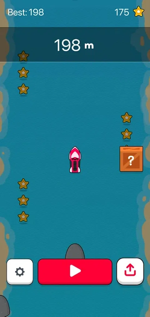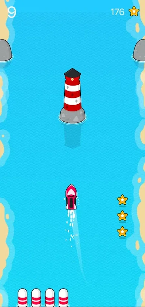 一艘向前快速移动的船在船前有几个障碍,如果船碰到障碍,游戏就会越过,因此,当您沿河移动时,避免碰到障碍并获得星星