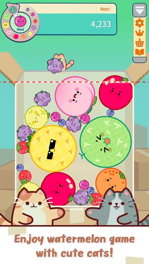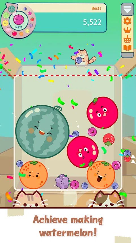 一款轻松简单但非常有趣的水果益智游戏! 在世界上最受欢迎的西瓜游戏中成为世界第一! 游戏特色* 1.随时随地都可以舒服轻松地享受,但是真的很好玩。 2.更好玩,因为你可以收集可爱的猫咪。 3. 这真的很有趣,因为当连击爆炸时压力就会消失。 4.水果的可爱表情很好玩。 5.用猫拳摇晃水果盒的乐趣很好玩。 如何玩游戏* 1. 将水果扔到所需位置。 2. 将两个相同的水果组合成一个更大的水果。 3.组合大型水果并创造连击以获得高分。 4、适时使用猫拳。 5、成为大师,名列天下第一。 任何年龄段的任何人都可以度过令人兴奋和愉快的时光。 推荐给您的朋友、孩子、父母和同事,一起享受吧