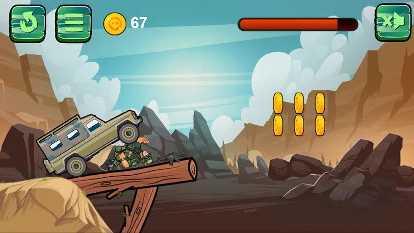 Army Driver 是一款有趣的驾驶游戏,您可以在 30 个关卡中竞速。您可以在车库购买新车并升级它们。 “军队司机”在 30 个具有挑战性的关卡中提供令人心碎的刺激。有一系列车辆可供选择,玩家可以沉浸在高速赛车行动中。车库是升级车辆、提高性能和风格的中心。每个级别都有独特的障碍和地形,将驾驶技能测试到极限。凭借令人惊叹的图形和身临其境的游戏玩法,“军队司机”提供令人难忘的游戏体验。准备好发动引擎,征服道路