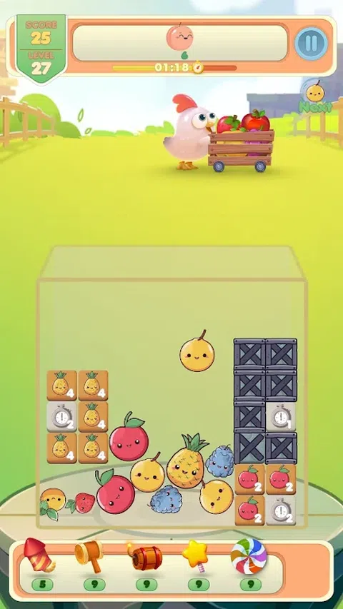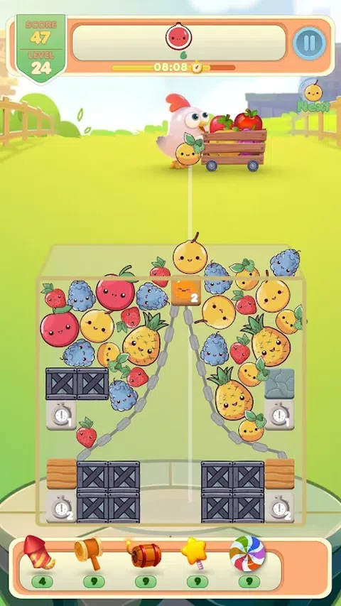 鸡扔水果,由你来合并它们并获得最大的水果。 在“事件”选项卡中清除所有关卡或以无尽模式玩 使用物品弹出更多水果并获得最高分,因此要在排行榜的顶部 不要忘记邀请您的朋友并与主题竞争. 玩得开心.