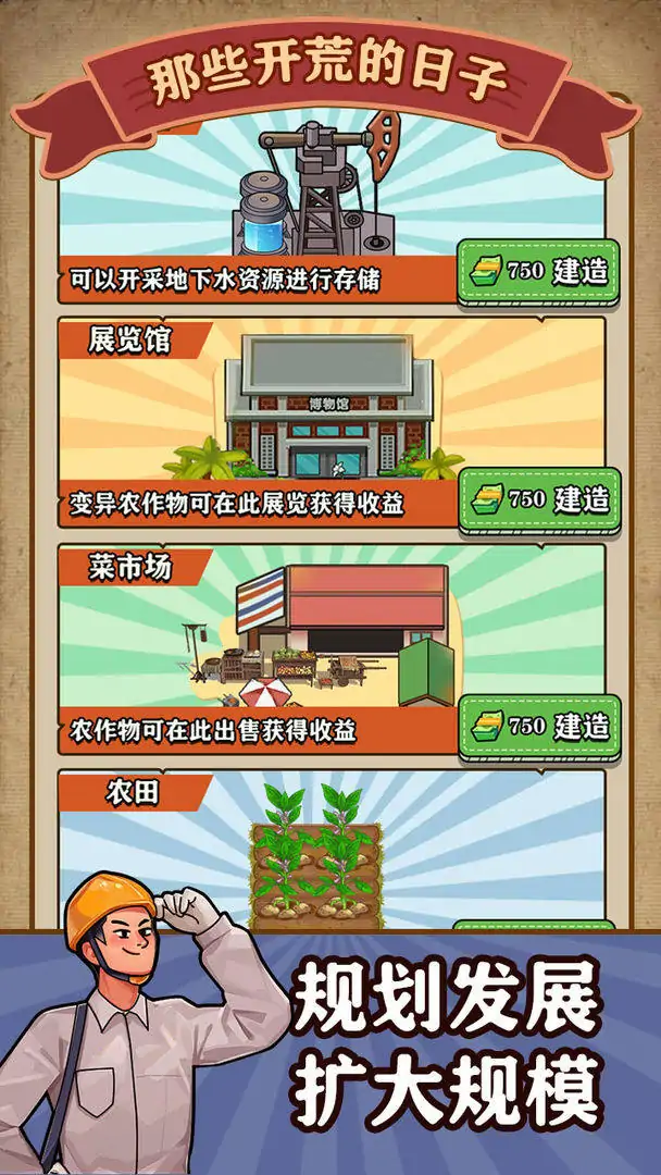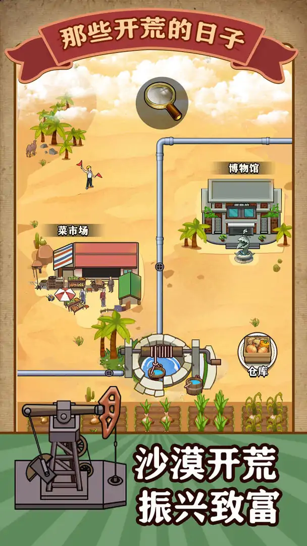 独自开荒沙漠,走上环保致富之路! 您需要在沙漠中寻找稀缺的水资源,并且合理规划灌溉路线,将一块块干旱的沙地摇身一变成为可耕作的农田,开荒沙漠需要源源不断的资金,您还需要在沙漠中修建菜市场、博物馆等商业化建筑,形成具有特色的沙漠经济体,为壮大开荒沙漠事业提供强而有力的资金支持 那些开荒的日子是一款教育如何合理规划资源的模拟经营游戏,在工具中用户通过模拟沙漠开荒场景,逐渐掌握土地规划、资源分配等技能,锻炼用户的规划和思考能力