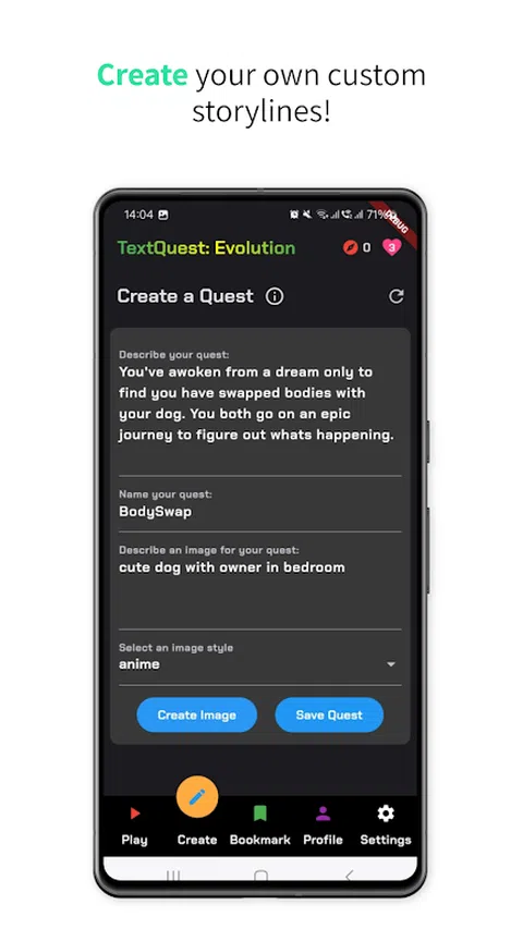 介绍 TextQuest:进化 - 互动故事讲述和冒险游戏的下一个级别!在原始 TextQuest 成功的基础上,我们的最新版本将您的体验提升到新的高度,具有令人兴奋的功能,让您以前所未有的方式进行控制。 踏上史诗般的旅程,通过做出的每个决定来塑造叙事。使用 TextQuest:进化,您不仅是玩家 - 您还是创造者。制作自己的任务并与世界分享,或潜入不断扩大的社区创建的冒险图书馆。无论你是拯救王国,探索遥远的星系,还是解开古老的奥秘,塑造命运的力量都在你手中。 保存您最喜欢的任务以备日后使用,在排行榜上争夺荣耀,体验改进的人工智能,确保每次游戏都是一次新鲜而刺激的冒险。TextQuest: Evolution 不仅仅是一个游戏 - 它是一个等待探索的无限可能性的世界。 凭借丰富、身临其境的故事讲述和迷人的角色,《TextQuest: Evolution》将您带到想象力无止境的奇幻领域。告别线性叙事,迎接每个选择都很重要、每条道路都会带来新发现的世界。 你准备好踏上终极冒险了吗?加入我们的 TextQuest:进化,今天就体验互动故事讲述的进化