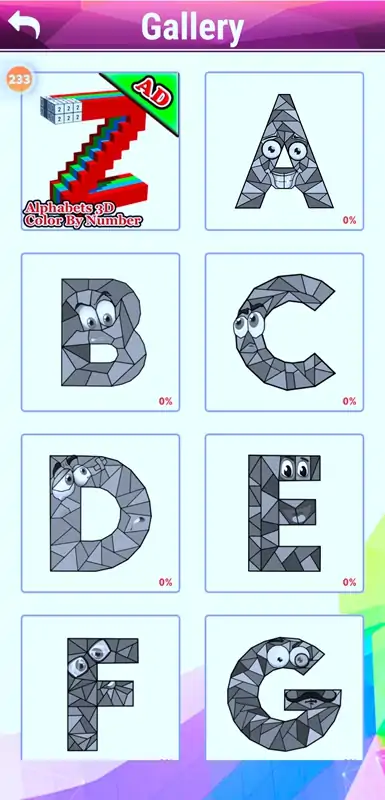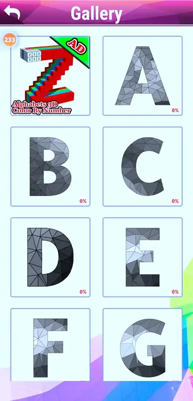 字母Polyart Color by Number是最具创造力的爱好之一.Poly Art Coloring是一种促进创造性思维和个性发展的聪明方法。用手工作是缓解焦虑,消除压力和使心灵平静的最佳方法之一。创意无穷的色彩组合。AlphabetNo. Coloring Pages是一本启发性的涂色书,带有精美的字母来着色和排列。如果您是艺术爱好者,那么这些适合大人的字母涂色书将让您过上美好的一天! polyaart涂色书,这些字母涂色页可以帮助您在忙碌了一天后放松身心并练习艺术技能。对于成年人和孩子来说,通过完成艺术品来尝试完成绘画很有趣。每种彩色字母都以其独特的色彩而栩栩如生玩法:-选择数字颜色。-本着色书中的每个数字代表一种不同的颜色。-识别标签通过点击数字颜色等区域。-然后为可闪烁的目标区域着色或将其放置在合适的区域。-一旦在所有目标区域上都使用了一个数字,数字就会自动消失等等。-像七巧板拼图,充满乐趣。功能:-色彩丰富的拼图字母-抗压着色-令人惊叹的游戏设计-享受创造抗压低聚艺术-重新发现着色的简单放松和乐趣-令人上瘾的低聚着色书-与Facebook,Instagram等人的朋友分享您的艺术书Art使我们能够同时发现自己和放松自己,因此您想要发现自己或迷失自己,可以通过下载令人惊叹的字母poly art拼图游戏.PolyArt按数字着色是教孩子逐步进行多边形艺术制作和基本字母识别的最佳方法。这是一款出色的抗压游戏,可提高您的绘画技巧。成人和孩子尝试通过完成绘画来完成绘画很有趣艺术品