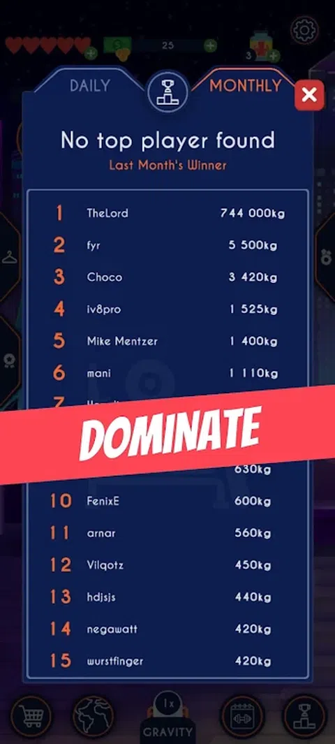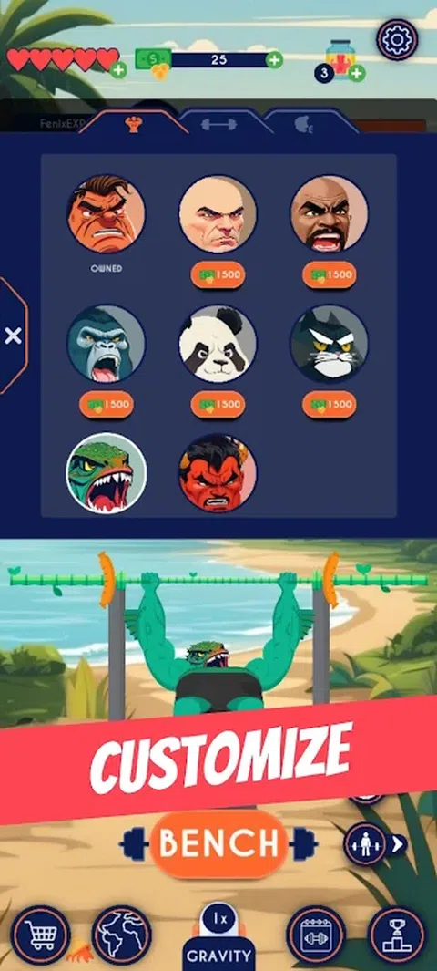 您准备好踏上前所未有的史诗般的举重之旅了吗?潜入肌肉泵运动的世界,在那里您将有机会探索各种独特的健身房,并最终努力成为举重界无可争议的冠军! ? 在不同的健身房锻炼身体: 走进各种各样的健身房。从坚韧不拔的地下动力室到异国情调的地点,您将体验全方位的举重环境。 ? 登顶: 成为终极举重运动员的旅程从举起最小的重量开始,然后逐步提高到举起巨大的负荷。随着您的进步,您将面临越来越困难的挑战,将您的力量和决心推向极限。您能承受压力并登上举重世界的顶峰吗? ? 自定义您的举重器: 通过使用各种服装、配件和个性化选项定制您的举重运动员,表达您的个性。在健身房里炫耀自己的东西时,炫耀自己的独特风格,赢得其他举重运动员和健身房爱好者的尊重和钦佩。 ? 与其他人竞争: 在全球范围内竞争,通过攀登全球排行榜来证明自己的举重实力。向大家展示你不仅是健身房中的佼佼者,而且是地球上最强大的举重运动员之一! 您准备好提升,竞争和征服了吗?健身房等待您的到来,成为最佳举重运动员的旅程现在开始。踏上令人难忘的举重冒险,以前所未有的方式考验你的力量、策略和决心