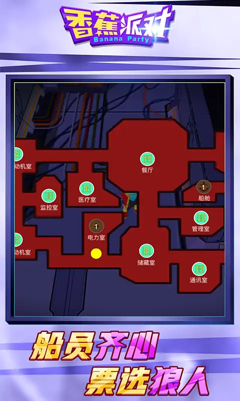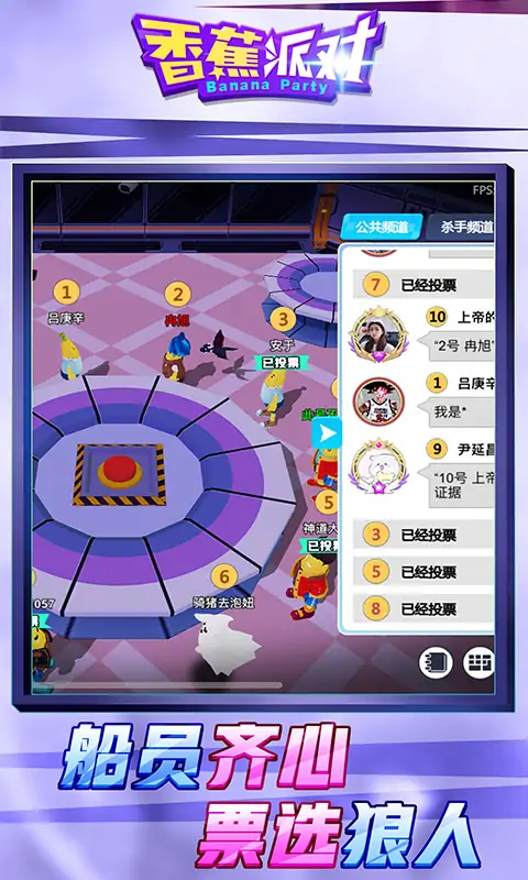 《香蕉派对》是一款基于狼人杀或者杀人游戏机制的角色扮演游戏。与传统狼人杀类游戏不同的是玩家可以控制一名杀手或者平民角色,杀手需要在地图中游走抓住机会刺杀平民,平民则需要躲避可疑的杀手并完成所有任务。当玩家死亡后可以召开会议,讨论和投票谁是杀手。游戏支持实时语音和打字两种沟通方式,一场正反派的口才较量和逻辑推理大战即将上演。老司机们!请开始你的表演! ★游戏类型介绍: 香蕉派对是一款解+推荐+动作的狼人杀类游戏,类似amoung us,比传统狼人杀跟简单易上手。且增加了丰富的角色,场景,任务,玩家需要操作角色完成任务的同时找出狼人。本游戏的研发团队为《狼人计划》原班人马,《狼人计划》曾在全网获得9000万注册用户,本作本作为《狼人计划》的续作产品,全新的场景和3D画面,精美的换装系统,让游戏的体验和效果更进一步。 ★玩法介绍: 《香蕉派对》是一款基于狼人杀或者杀人游戏机制的角色扮演part game游戏。与传统狼人杀类游戏不同的是玩家可以控制一名杀手或者平民角色,杀手需要在地图中游走抓住机会刺杀平民,平民则需要躲避可疑的杀手并完成所有任务。当玩家死亡后可以召开会议,讨论和投票谁是杀手。游戏支持实时语音和打字两种沟通方式,一场正反派的口才较量和逻辑推理大战即将上演。老司机们!请开始你的表演! ★美术风格: 本游戏采用香蕉人造型卡通3D角色,画面清新可爱,老少咸宜。游戏采用UNITY3D引擎打造,精美的光阴投射场景营造,让本身紧张刺激的玩法,更具有沉浸体验。 ★玩家人群: 对解谜,推理,休闲,动作类游戏有兴趣的玩家应该会喜欢这款游戏。既有游戏深度,又容易上手入门。 ★游戏特色: 游戏采用真人PVP,实时语音,可以自由发挥你的演技和口才,投票找出狼人,或者扮演狼人刀其他平民身份玩家。游戏中有健全的聊天,好友,家族,组队系统,非常适合春节期间小伙伴在线上进行一场社交游戏。也可以线下面对面开黑更欢乐,当然要注意疫情防控哦。