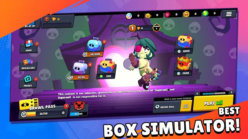 安杰洛 Brawl Stars 盒子模拟器适用于移动平台,具有 Brawl Stars 3 对 3 战斗和生存之战!在各种 BS 模式的拳击模拟器中独自或与朋友一起玩。 Brawl Pass & Case Simulator Brawl Stars: Brawl Stars 2D 游戏提供任务,打开 Brawl Stars 盒子,赚取免费宝石并获得独特的皮肤 Brawl Pass。 在斗殴明星的拳击模拟器中成为明星玩家: 证明你是我们盒子模拟器中的佼佼者,提高你在领导者列表中的排名,那里聚集了最好和最强大的斗士!对于那些喜欢零斗殴的人。无需斗殴明星黑客 - 享受斗殴明星盒模拟器新。 最佳游戏:在拳击模拟器中获得斗殴通行证并解锁斗殴之星拳击,并升级数十个斗殴之星 2D 战斗机 - 具有强大超级能力的强大斗士,明星部队和斗殴小工具将有助于赢得斗殴之星拳击模拟器!收集独特的 bs 盒子,在其他《荒野乱斗》2D 玩家中脱颖而出。获取《荒野乱斗》通行证,在《荒野乱斗》宇宙中最不同的角落战斗!对于零斗殴爱好者。 游戏模式中的冲突 - Brawl Stars 游戏: 快节奏的战斗将有助于快速确定游戏的获胜者 Brawl Stars! 打开斗殴之星盒子,斗殴之星盒子和斗殴之星盒子以获得斗士。所有 Brawlers BS 都放置在 Brawl Stars 盒子模拟器中。 用强大的超级能力、星际部队和小工具升级各种斗星斗士!在 Brawl Stars Simulator Boxes 中收集独特的皮肤。发现最好的游戏!但请记住:这不是《荒野乱斗》破解版,这是一个拳击模拟器。 《荒野乱斗》模拟器正在不断开发中: 期待在《荒野乱斗》模拟器中出现新的战士 - 强大的斗士即将到来。以及《荒野乱斗》拳击模拟器中的皮肤、《荒野乱斗》盒子、游戏和游戏模式。 Brawl Stars 拳击模拟器的特点: - 所有斗士都有独特的攻击技术和特殊能力“超级”。 每天都有新活动《荒野乱斗 2024》。 本地和全球领导者名单。 - 战士的外观可以在皮肤的帮助下改变。使用宝石、斗殴明星盒子和斗殴盒子。 Brawl Stars 的拳击模拟器。 - 沉浸在最佳的《荒野乱斗》模拟器游戏中 - 《荒野乱斗 2》等待着您,零星模拟器拳击和令人难忘的情感