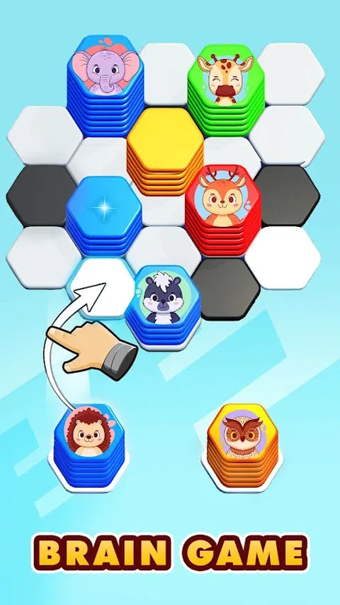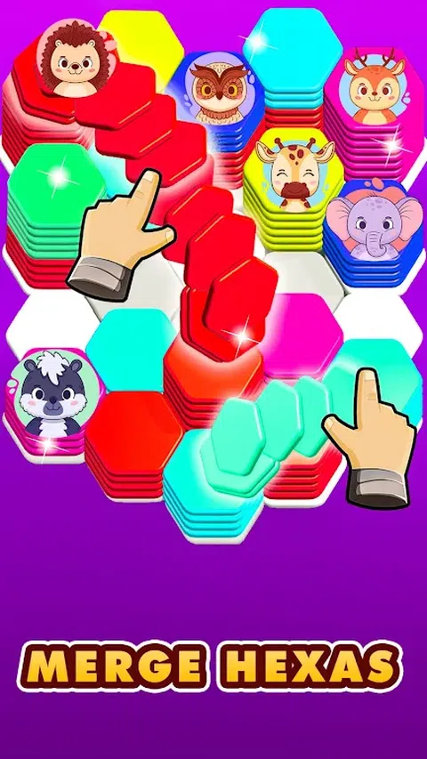 玩六角拼图排序颜色匹配!这是一款完美有趣的动物分类游戏,您可以在其中解决难题并匹配颜色。您会看到六角形图块,您需要对它们进行分类和堆叠,以在颜色益智游戏中匹配颜色。 在六边形排序游戏中,有不同类型的图块可用,每种图块都有独特的功能来对项目进行分类,例如蛋糕分类。在这个六边形拼图分类游戏中,您可以根据口味、设计和颜色六边形游戏对不同品种的多个蛋糕进行分类和合并。 通过使用动物分类游戏中的智能块按顺序排列动物,并将它们与序列合并,探索动物分类。通过图像了解不同的动物物种,并在这款以动物为主题的引人入胜的六角分类游戏中对五颜六色的动物积木进行分类的同时,匹配以制作适当且智能的积木。 六角分类游戏是一种大脑训练,有助于提高您的颜色准确度技能。通过根据颜色和排序合并六边形图块来赚取更多金币。解锁多种风格的六边形图块供您玩,并选择您最喜欢的一个。六边形匹配越精确,您作为六边形分类游戏专家的能力就越好。立即在六边形分类游戏中玩六边形合并颜色,成为六边形分类大师! 每个级别都有不同的挑战,使拼图颜色游戏轻松而令人满意。享受合并图块以创建完美匹配的乐趣。六边形拼图排序颜色匹配是经典排序益智游戏的酷转。六边形分类游戏在六边形游戏中具有出色的 3D 图形和美丽的色彩。 立即下载,开始你的多彩冒险