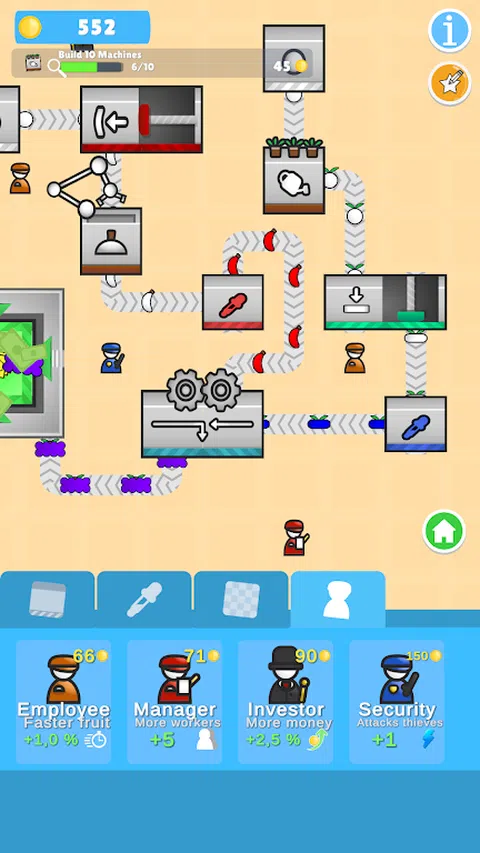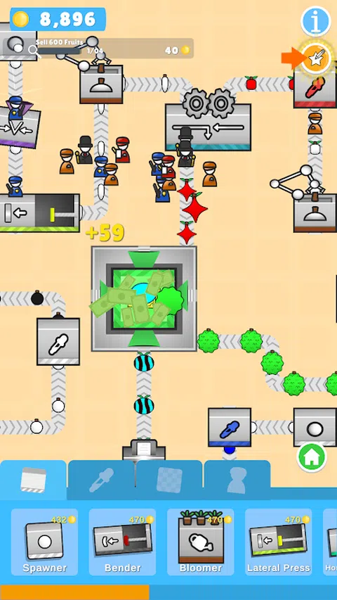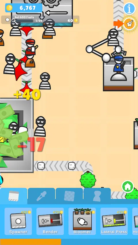 在《水果工厂》中,您控制一家通过出售水果赚钱的工厂。 您可以放置生成器机器来创建平淡的白色水果。 在游戏过程中,您可以解锁新机器,并通过传送带将它们连接在一起 - 改变它们的形状,打印纹理,甚至为它们着色!随着游戏的进行,您将能够通过混合生产线和合并水果来解锁新的水果。 将你的水果卖给送货机,升级你的工厂并雇用工人来帮助你! 但要小心小偷—他们会偷你的水果!你必须雇佣保安来保护你的珍贵水果