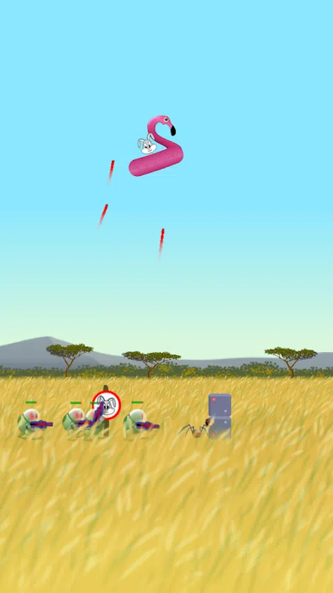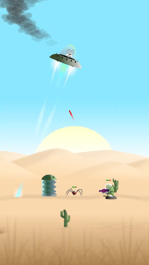 绿色外星人已经占领了地球,并从中吸取了所有能量。森林里的一只简单兔子设法从入侵者的眼皮底下偷走了一个盘子。 游戏目的: 摧毁所有外星人和所有与之相关的物体。使用激光枪、炸弹,或用飞碟击中它们。一定要收集硬币,它们将有助于购买和升级新的不明飞行物。 游戏有五个地点: - 森林; - 沙漠; - 冬季; - 丛林; - 萨凡纳。 控制: 用双手垂直握住手机。通过单击屏幕的左半部分,玩家将向左移动。当您将右半部分分别按到右侧时。屏幕底部的红色按钮用于击中不明飞行物