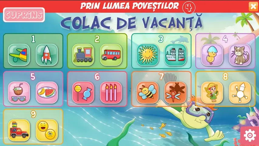该应用程序是DEMO版本,包括2个edu-fun游戏。 要查看所有内容,您可以购买完整版。 如果您购买了笔记本“Prin mulema povestilor - Colac de Vacationa”,请输入内封面上的访问代码,即可免费使用完整版本。 两个可爱的角色,小精灵布布和仙女艾里斯,乘坐各种交通工具(陆地、空中和水路)旅行,庆祝儿童节,与小动物一起玩耍并制定假期计划。 该应用程序包含 18 个教育娱乐游戏,针对小群体(3-4 岁)的儿童,包括来自所有体验领域的综合学习活动