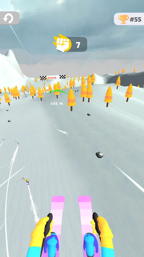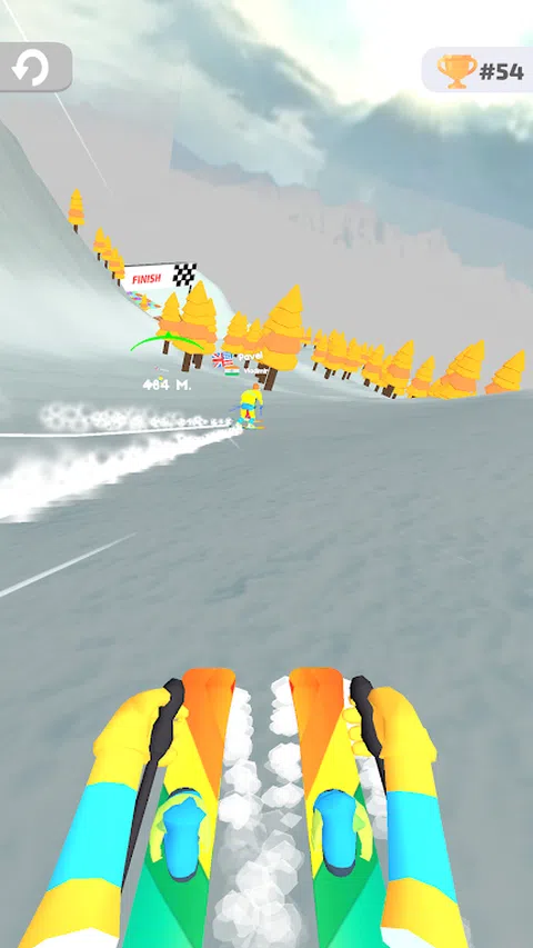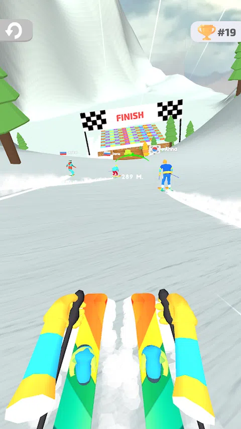 选择单板滑雪或滑雪参加比赛。成为 100 名参赛者中第一个到达终点线的人。在不与障碍物碰撞的情况下前进,并通过与竞争对手碰撞来消除它们