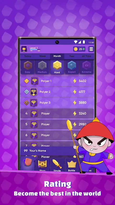 Battle Royal Sudoku Puzzle 是第一款可以在拼图战斗中战斗的益智游戏,每个人都可以使用这款令人上瘾的数独游戏,在 Google Play 上受到许多用户的欢迎。 您每天会收到超过 5000 万个具有挑战性的谜题,以训练您的大脑。适合初学者和高级玩家的脑数独。每个拼图只有一个真正的解决方案。经典数独是一款益智游戏,可锻炼您的大脑、逻辑思维、记忆力,是消磨时间的好手。 主要特点 ✓数独谜题有 4 个难度级别:新手、简单、中等、困难和专家。非常适合初学者和经验丰富的数独玩家。 ✓每日挑战:完成每日挑战并收集奖杯和奖励。 ✓铅笔模式 - 根据需要打开/关闭铅笔模式。使用铅笔模式,您可以启用排除此行中使用的数字的智能提示功能。 ✓高亮数字 - 避免在行、列和块中重复数字。 ✓智能提示 - 如果您遇到困难,可以帮助您找出数字。 在战斗数独模式中,为成为数独之王而进行的战斗在您面前展开: ✓与其他玩家一起计时,获得奖牌和关卡 ✓游戏平衡的额外难度级别 ✓创建自己的游戏并管理规则 ✓邀请朋友一起在数独中竞争 ✓为您的朋友组进行封闭对战比赛和封闭式锦标赛 ✓升级以获得额外动力 ✓季节性活动和奖品等待着大家 在这个“皇家数独”应用程序中,您还可以 ✓自动突出显示相同的数字 ✓放置数字后,自动从所有列、行和块中删除注释 ✓自动保存 - 暂停游戏并继续游戏而不会丢失进度。 ✓数独在线和数独离线 您可能还会发现以下大脑数独功能很有用: ✓玩数独时打开/关闭计时器 ✓超过 5000 万个数独,无尽的数独。 ✓良好的游戏玩法 ✓直观的界面 ✓简单的工具,简单的控制 ✓周到的布局 对于那些寻求更具竞争力的人来说,数独之战是一个不错的选择。在这个版本的游戏中,玩家在实时多人游戏中竞争,试图比对手更快地解决难题。这为已经具有挑战性的数独游戏增添了额外的刺激和复杂性。 我们提供 5 个联赛,每个联赛都会增加从初学者到更复杂数独的难度,这些联赛显示了战斗中数独大师的水平。 这是面向数独爱好者的数独应用程序。如果您喜欢玩数独游戏,则应下载游戏应用程序。这个益智游戏包括一个 9x9 的网格网格,这些网格被划分为 3x3 的小正方形。游戏的目的是用 1 到 9 的数字填充网格的每个单元格,并且每行、每列和 3x3 的正方形必须只包含 1 到 9 的所有数字一次。 我们的数独益智应用程序具有直观的界面、易于控制、清晰的布局和均衡的难度级别,适合初学者和高级玩家。它不仅是消磨时间的好方法,还可以帮助您思考,使您更具逻辑性并拥有良好的记忆力。 让我们来一场头脑风暴吧