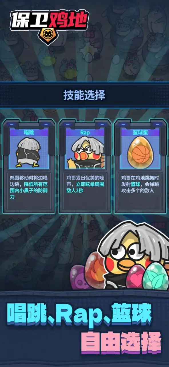 《保卫鸡地》是一款玩法独特的肉鸽塔防游戏 鸡哥一觉醒来发现自己的“鸡地”竟然被一群小黑子包围了! 这怎么能忍?于是鸡哥拿起手中的鸡蛋开始反击 等等… 鸡蛋?对鸡哥可以在“鸡地”下蛋,通过多种多样的鸡蛋迎头痛击如潮水般涌来的敌人,并从敌人身上缴获战利品升级“鸡地”,武装鸡哥~