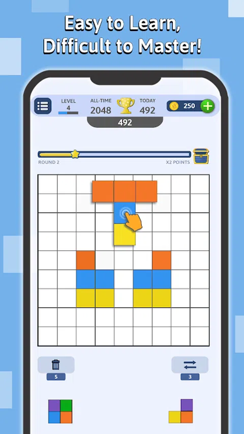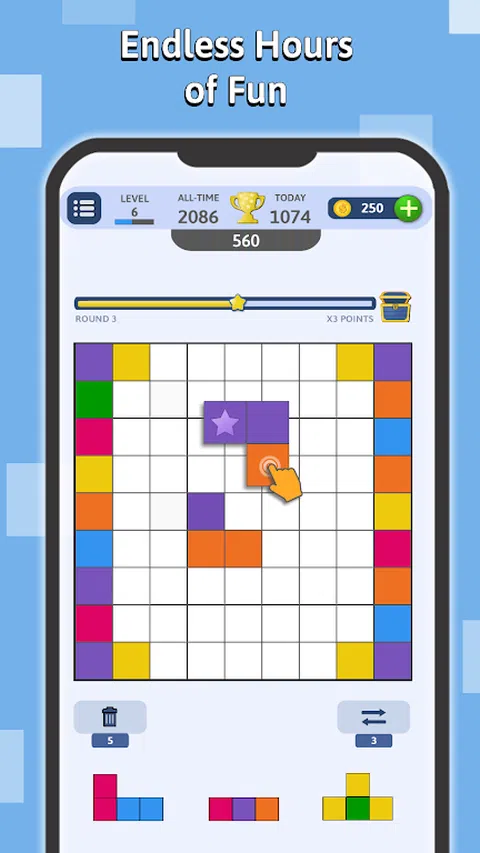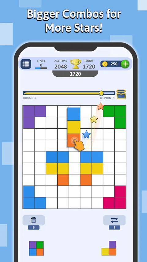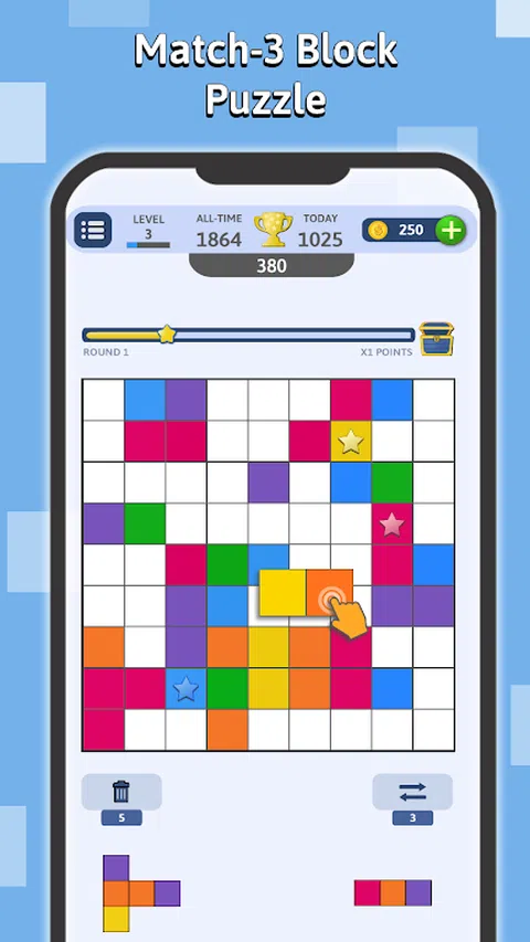 Blockumix:方块拼图与三消游戏的结合! 通过 Blockumix 释放您内心的拼图大师,这款游戏将经典的方块拼图与令人上瘾的三消乐趣相结合!在这个充满活力的冒险中,炸开五颜六色的方块,触发史诗般的连击,并征服不断变化的挑战。随时随地玩 - 无论在线还是离线,Blockumix 都能让您乐在其中! 匹配并爆破你的胜利之路: 清除彩色方块:在 9x9 网格上放置并匹配方块,使它们消失。比赛规模越大,得分越多! 拥抱连击热潮:一次创建多个匹配以触发令人兴奋的连击并赢得奖励星星。 收集星星奖励:每收集 10 颗星星,您就可以进入下一轮,解锁新的挑战和硬币等游戏内奖励。 提升您的游戏玩法:使用硬币购买强大的助推器,帮助您克服游戏中的棘手时刻并获得更高的分数。 不仅仅是匹配: ★ 回合奖励:在每个新回合中增加分数乘数,让兴奋持续下去。 ★ 战略深度:掌握方块放置和组合创造的艺术,以最大限度地提高您的分数并征服具有挑战性的关卡。 ★ 无尽的乐趣和挑战(也可以离线!):无论您在线还是离线,Blockumix 都提供无尽的解谜配色娱乐时间! ★ 易学难精:Blockumix 提供直观的游戏玩法,易于上手但难以掌握。随着你的进步,谜题变得更加复杂,需要战略思维、熟练的方块放置和敏锐的色彩匹配。 准备好 Blockumix 了吗?立即下载,踏上充满活力的益智冒险! 主要特点: ★ 方块拼图和三消游戏的独特融合 ★ 参与奖励积分和星星的组合系统 ★ 基于星星的回合进程,提供令人兴奋的奖励 ★ 解锁助推器以增强游戏玩法 ★ 视觉震撼的图形和充满活力的声音效果 Blockumix 可以免费玩,也可以选择应用内购买。我们尊重您的隐私,不会收集任何个人信息。 立即下载 Blockumix,加入方块爆破的乐趣