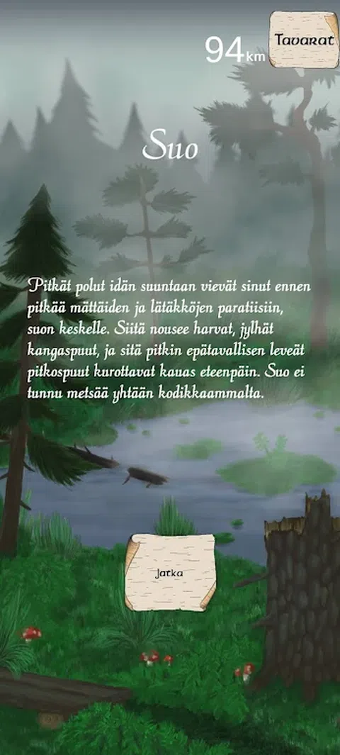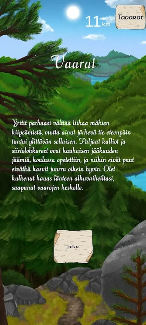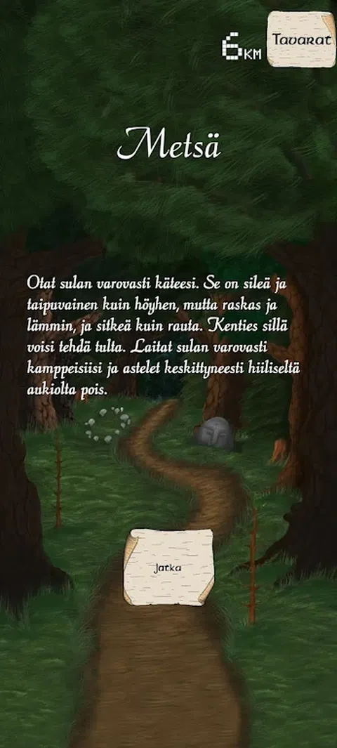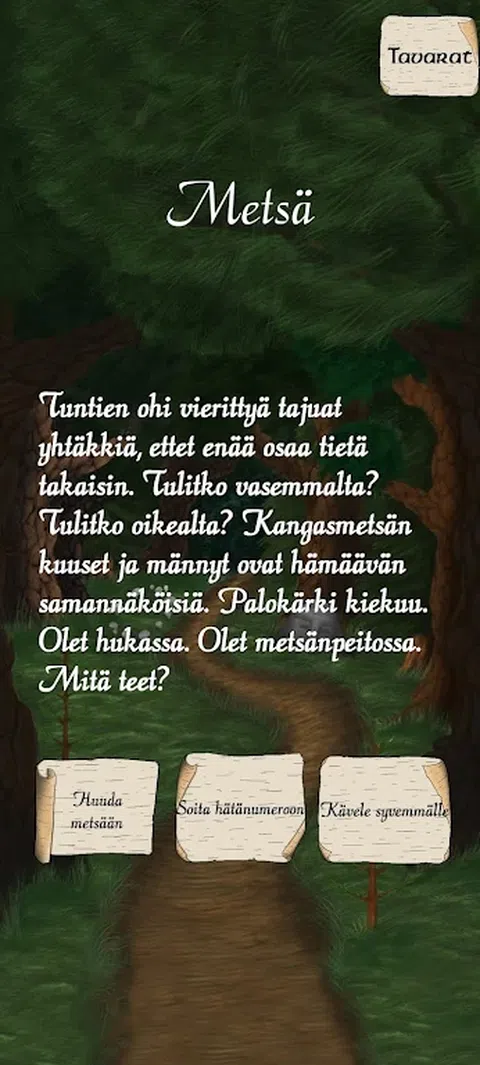 选择你自己的冒险 - 文字冒险 在芬兰森林徒步旅行时,您会迷失在神秘的森林王国 Metsänpeito 中。你的目标是找到回家的路。然而,森林的低语声、石头的沉默目光和鸟儿渴望的歌声却让您着迷。 要找到回家的路,你必须尊重自然,欣赏芬兰的自然地标,邂逅芬兰民间传说中的各种古老生物,学会在森林中行走。 选择你自己的冒险:你所做的每一个选择都会产生影响,塑造你面前展开的蜿蜒道路并决定故事的结局。 探索芬兰荒野:你的漫游将带你到不同的栖息地,每个栖息地都有自己的挑战和遭遇。 收集宝藏并克服障碍:寻找可以在旅途中帮助您的物品,从一块不起眼的木头到传奇的维纳莫宁之剑。 发现古老的地标:在冒险过程中,您将遇到芬兰风景中古老的真实地标。 邂逅神秘生物:Metsänpeito 森林王国充满了可怕、调皮的野兽和神秘生物
