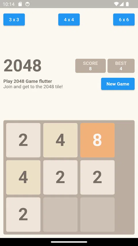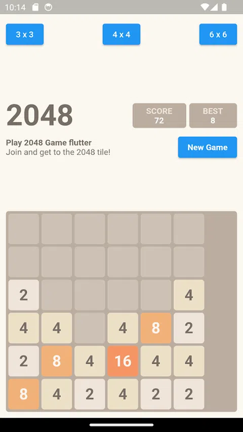 游戏:2048 有 3x3、4x4、6x6 等 3 种游戏画面供玩家选择 游戏:2048 玩家将向上、向下、向左、向右滑动,将 2 个相同数字的单元格合并为 1 个单元格,新值等于旧单元格中数字值的 x2,滑动直到单元格消失
