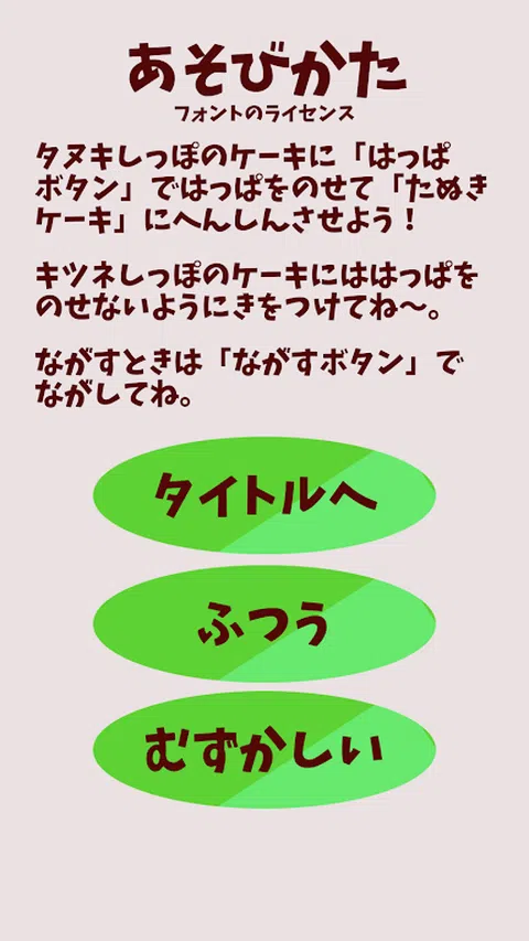 “Genkidama!基于SDGs的治疗游戏项目”专注于发育障碍(自闭症、阿斯伯格综合症等)。 治疗患有综合症、注意力缺陷/多动障碍 (ADHD)、学习障碍和抽动障碍的儿童 我们开发并提供教育和教育游戏应用程序。 这是一款专为残疾儿童设计的简单游戏应用程序。 ◆“变身!狸猫蛋糕”的规则超级简单◆ 一个简单的游戏,你把叶子装饰在有尾巴的蛋糕上,然后把它变成浣熊蛋糕! 当你开始玩游戏时,一个带有尾巴的蛋糕会从右侧流出。 带尾巴的蛋糕将在屏幕上暂停片刻。 如果你在浣熊静止时将一片叶子放在它的尾巴上,你就可以把它变成浣熊蛋糕并赚取积分。 如果是“狐狸”尾巴,就让它流动吧。 如果你把一片叶子放在狐狸的尾巴上,剩余的生命就会减少,当剩余的生命为零时游戏就会结束。 您可以从“简单”和“困难”中选择游戏的难度级别。 选择适合你的难度,制作尽可能多的浣熊蛋糕,争取最高分