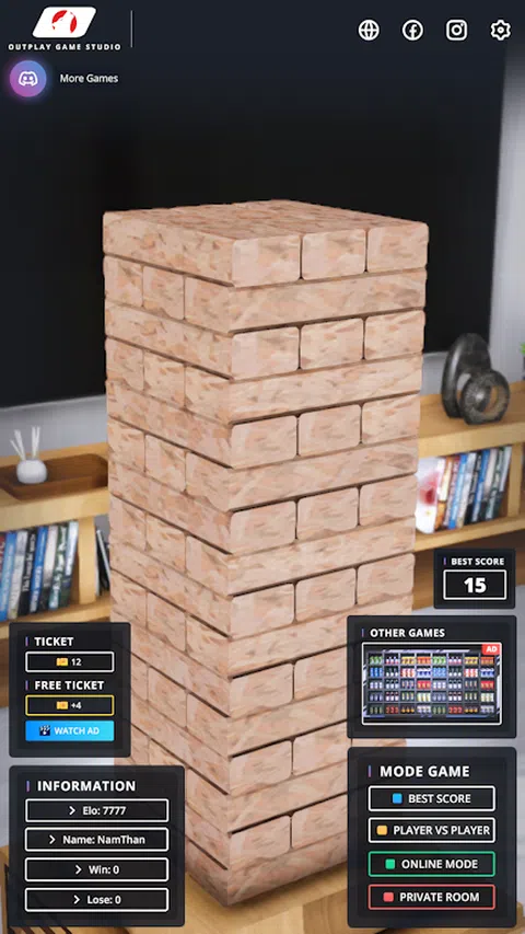 注意:Wood Tower 3D Online 是一款在线游戏。需要良好的互联网连接。在开始游戏之前检查您的互联网连接! 木塔 3D Online 是一款在线 3D 休闲棋盘智力游戏。您可以与陌生人在线玩,也可以与计算机或朋友离线玩。祝你好运,玩得开心! 特点: - 美丽的图形 - 2 种离线模式:最佳得分,玩家对战 - 2 在线模式:PVP 1 对 1,私人房间(与朋友一起玩) - 体积小(无需额外下载) - PVC 和 PVP 在线模式: - 2 名玩家 让我们开始玩吧