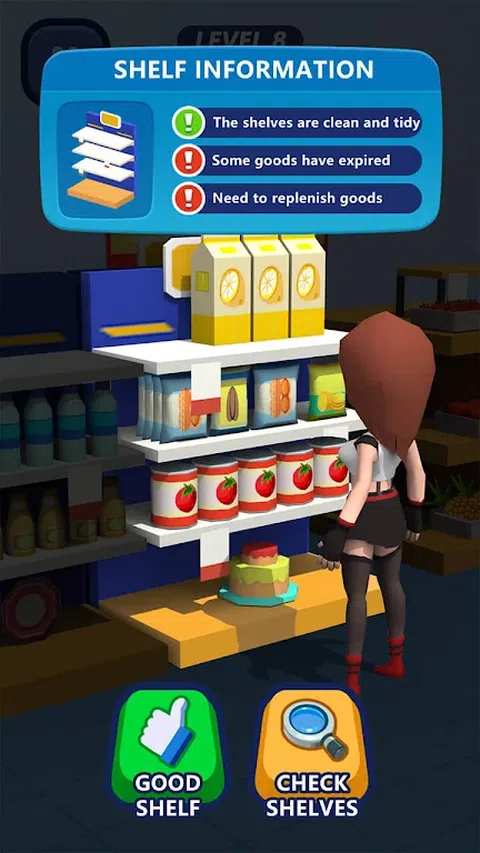 玩家需要在游戏中扮演一名超市店员,对货架进行检查,以便及时发现货架的问题,如果出现商品不足,则需要对货架进行补货,若货架已经杂乱不堪则需要立刻整理货架,时刻保持货架的商品充足和整洁,为进店的顾客提供一个舒适、货物充足的购物空间。 除此之外,还要照顾好每个进店消费的顾客,及时了解他们的需求,根据顾客们的需求,提供相应的帮助,让他们能更舒适更便捷的买到自己需要的商品。不过,也不是每个顾客都是来购物的,有一些不怀好意的家伙假扮顾客可能对商店造成破坏和损失,也需要店员及时发现和处理。超市经营状况百出,到底能不能经营好,让我们拭目以待.