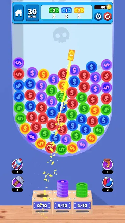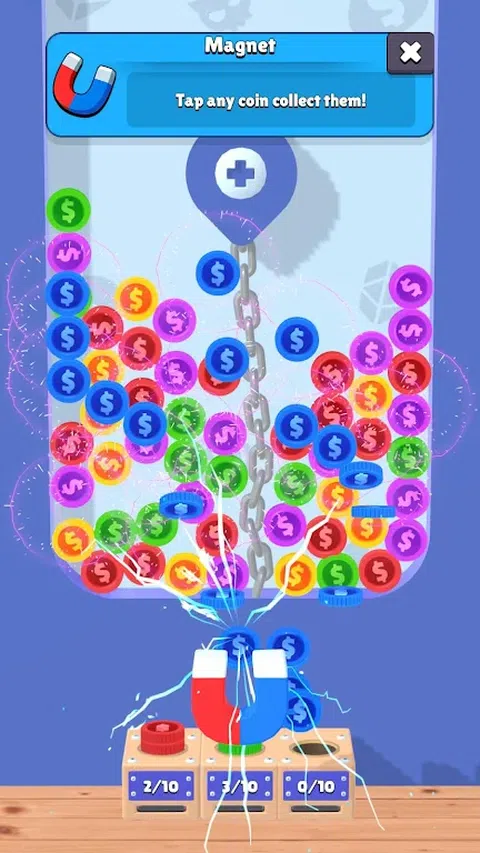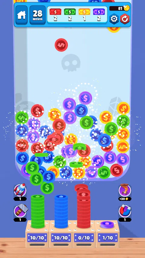 《Coin Stack Frenzy》是一款非常容易上瘾的有趣益智游戏。点击相同颜色的硬币组进行堆叠。一旦您达到 10 个或更多硬币,堆叠的硬币将合并为纸币。完成所有目标以通过下一关