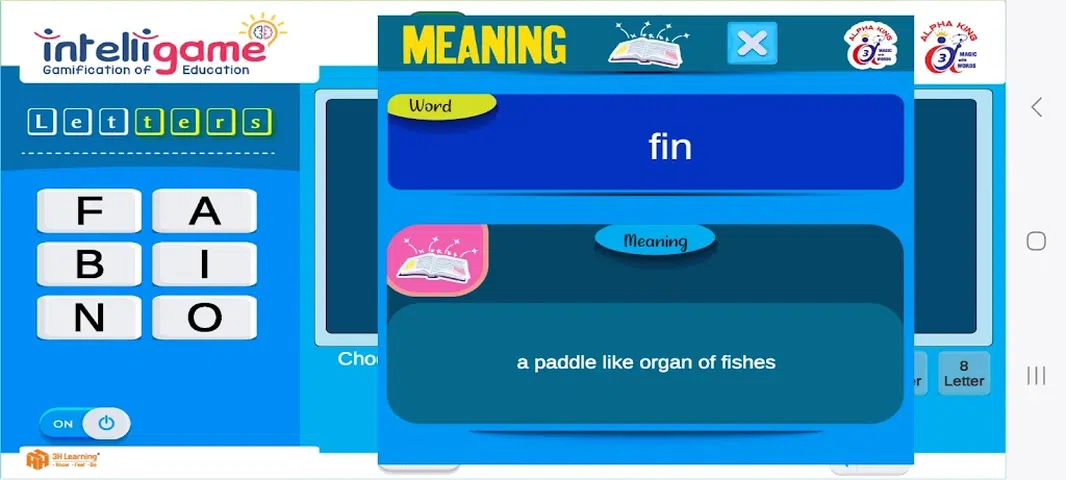 来自 3H Learning 团队的问候! Alpha King 3 不是一个独立的应用程序。 它必须与 Word Whiz 书 - 3 级结合使用。 Word Whiz 3 级书籍充满了词汇谜题。 给出了线索 / 含义,用户必须发现正确的单词来填写 WordWhiz 书籍第 3 级中的谜题。 但是,如果他们无法找到答案,可以使用 Alpha King 3 应用程序。 该应用程序有 3 个部分: 1. 单词含义 - 可以将《单词奇才》书中给出的线索 / 含义(第 3 级)输入到第一部分中,以生成正确的单词。此部分可用于查找《Word Whiz》书(第 3 级)中除“Word Cast”谜题之外的所有谜题的答案。 除了立即获取单词,用户还可以选择通过单击“提示”按钮在发现单词之前逐步获取一个又一个线索的过程中发现单词。这为学习过程增添了很多刺激。 如果计划得当,这个过程可以完全转变为整个家庭和兄弟姐妹之间的有趣学习。 单击“搜索”按钮也可以立即找到该单词。答案立即出现。 用户可以看到句子中使用的“单词”。印度的背景、历史、地理、道德、价值观、时事都通过这些句子尽可能地呈现出来。 2. 应用程序的第二部分是“Word Cast”。例如,玩家可以选择一个数字,比如 5。在形成的 5 个空方块中,玩家可以选择 5 个不同的字母。现在,用户可以寻找可以使用这些字母组成的不同单词。该应用程序展示了可以使用这些字母组成的各种单词(来自仅适用于此级别 3 的数据库)! 3. 还可以学习每个单词的拼写。 有了笔记本,用户还可以选择写下听到的内容。 Alpha King 3 应用程序不仅可以帮助用户发现单词(如果提供了含义),还可以根据提供的字母表选择生成单词。 这个应用程序还可以帮助用户提高他们的听力、阅读和写作技能