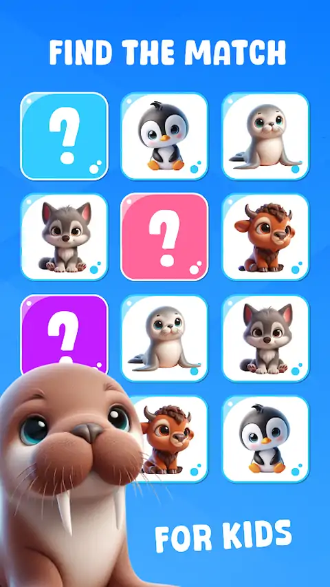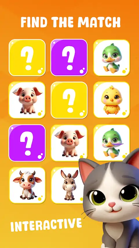 欢迎来到“Memorama Kids”!专为小孩子设计的充满乐趣和挑战的游戏!您准备好测试您的记忆力并与您的朋友一起度过激动人心的时光了吗? 在“Memorama Kids”中,孩子们可以踏上充满色彩和可爱角色的激动人心的冒险。游戏的目标很简单:找到匹配的纸牌对! 每个游戏都有有趣的设计和主题,包括可爱的动物、有趣的玩具和美味佳肴,都是在玩乐的同时探索和学习的新机会。从不同的难度级别中进行选择,挑战您的技能,并在每个游戏中提高您的记忆力