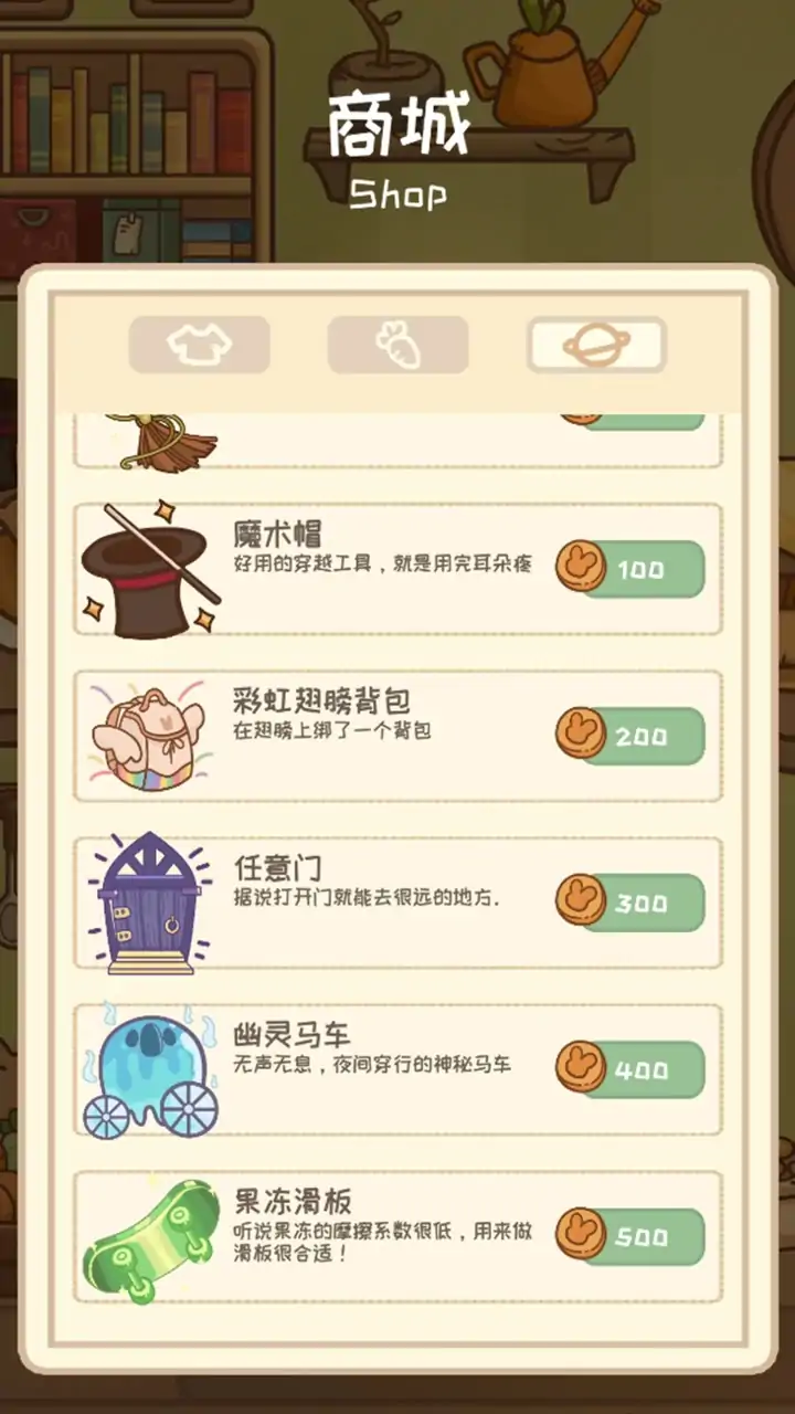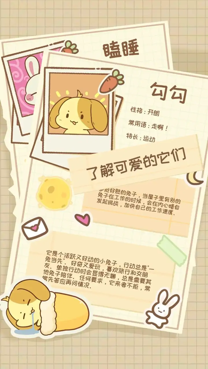 《兔兔游记》是一款治愈系的养成放置类游戏,让你与兔兔宇宙建立神奇的联系!在这个游戏中,兔兔们在温馨的小屋中生活和休息。你不仅可以观察它们的日常,还能安排它们去打工赚取金币。 赚到的金币可以在商场购买各种行李和装备。只要你为兔兔们准备好行装,它们就会在空闲时间出门旅行。旅途中,兔兔们会给你寄来充满爱意的信件,分享来自不同星球的独特礼物。这些礼物不仅令人惊喜,还可能伴随着新的兔子蛋——究竟是升级还是新的伙伴?你将会收到什么惊喜呢? 快加入《兔兔游记》,与兔兔们一起畅游宇宙,体验一场不同寻常的冒险吧!