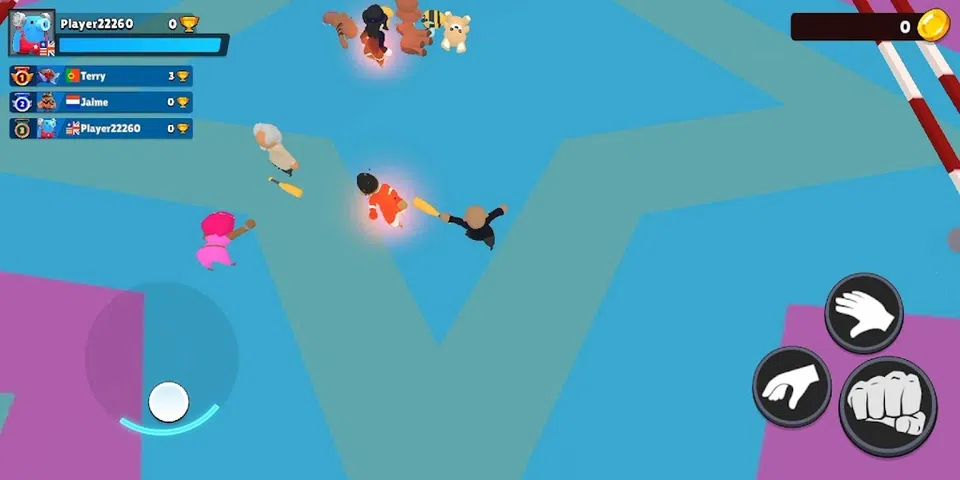 游戏过程分为两个部分。首先,你跑过有很多陷阱的大型竞技场,其他玩家可以抓住你并扔掉!其次,您需要收集一定数量的 K.O。在第一阶段获胜的人有更多机会在第二阶段获胜