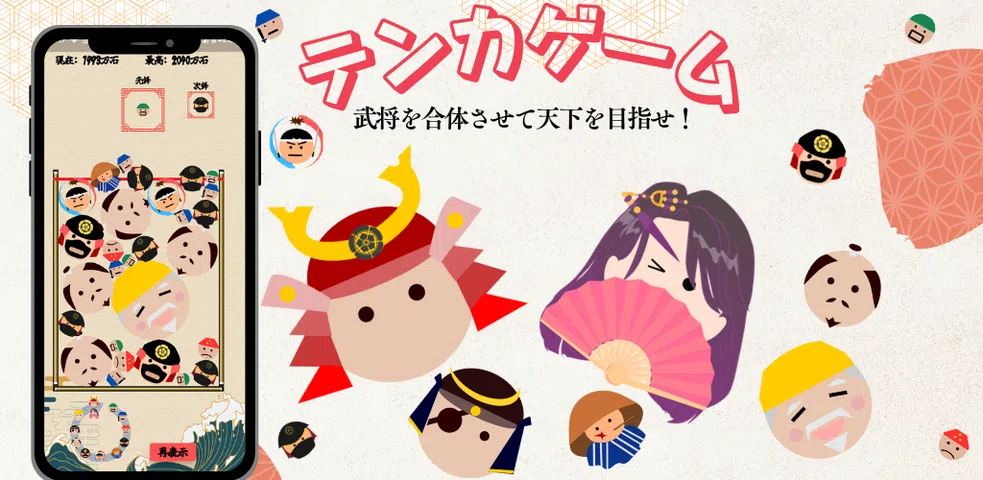 我尝试了一个西瓜游戏风格的组合拼图,里面有战斗军阀而不是水果。 连接相同的班级并将其组合 将自己从农民提升到将军! ■班级表(从上到下) 幕府将军/公主 (*) 副将军 掌门大名 大名 武士将军 剑客 福来坊 足轻头 足轻 训练军士 农民 *如果您合并副将军,它将成为将军→公主。 它们将按顺序出现。如果你将将军和公主结合起来,他们都会消失。 ?使用您的助手忍者在战斗中获得优势! 通过组合军事指挥官,您可以获得 Koban。 您可以使用 Koban 雇用忍者。 您可以使用忍者技术将战斗局势转变为您的优势。 1. 变化的艺术(300 万亮) 可以变身为农民、训练士兵、足轻、足轻头或 furaibo。 2. Earthton no Jutsu(500 万亮) 角色可以从下面放置。 3. 刺杀术(800 万亮) 您可以擦除指定的字符