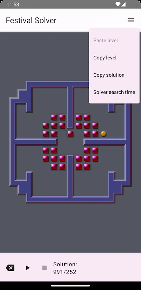 Festival 是基于 FESS 搜索算法(发表于 CoG 2020)的推箱子求解器。Festival 是第一个解决 XSokoban 基准测试所有 90 个级别的程序。它在其他关卡集上也得分很高。 适用于 Android 的 Festival 可以与任何支持求解器插件(例如 Soko+)的推箱子克隆集成。 适用于 Android 的 Festival 基于 Yaron Shoham 制作的适用于 Windows 和其他操作系统的 Festival