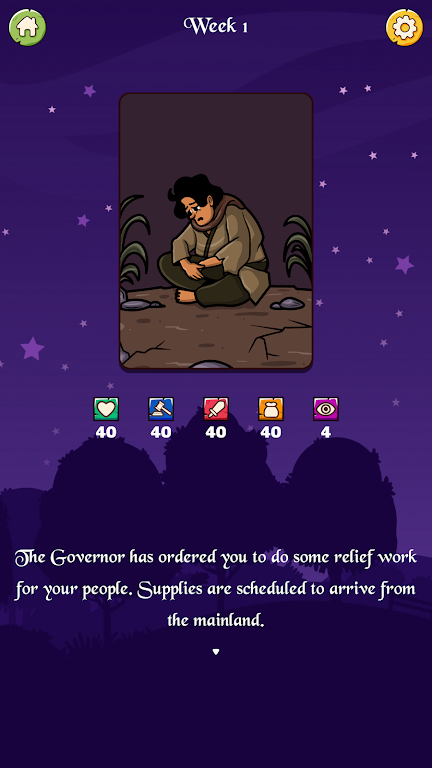 你是中世纪村庄中的一名新上任的实习地方官。请慎重选择每一道题,以维持好民心,秩序,军事实力等各项指标。且还要通过剧情活动来克服土匪团,饥荒,狂热信徒,瘟疫等重重危机。你在艰难抉择的十字路口做出的每个决定,都将关乎你和你村庄的命运走向! 【详细信息】 在很久很久以前,某个王国的南部海域有一座巨大的岛屿。你被派遣至那座岛担任其某个村庄的地方官。开始了为期4周的试用期。只不过试用期间并非一帆风顺。因灾荒而崩溃的村庄经济,充满威胁性的土匪团,恐怖的瘟疫,王国极度排斥的土著宗教等等各种外界因素,都在不断地威胁着你的治理。每当这些事件发生时,你都要做出相应的决定来克服村庄的危机。你做出的每个选择,甚至会直接改变你在试用期结束后的命运走向,或是最终结局。正因如此,你的每次选择都至关重要。 每当你做出选择时,民心,秩序,军事,物资等指标就会发生变化。相关指标的数值下降意味着村庄即将走向毁灭。预判你的选择可能会改变什么指标,改变多少,以此做出最好的决定,以克服村庄面临的最大危机。 你的上司 — 岛上的总督,并不是一个很有耐心的人。如果你的治理并未达到他的理想预期,很有可能就会被他立刻免除实习地方官这个头衔。只有有效的运用居民们的心,军事和物资,才能顺利地结束试用期。当然你也不是一个人在战斗,当你在治理村庄的过程中,也有可能会遇到的给予合作的帮手,你可以和他们齐心协力,克服村庄的危机。 【特点】 - 突发事件及危机:每当游戏开始时,就会有新的活动在等待着你。另外,游戏还会根据你的决定,出现多样且完全走向不同分支的剧情线。 - 模拟村庄管理:你必须根据标示着村庄状况的各项指标做出判断。你的选择会改变指标,且指标会对村里发生的事件造成决定性影响。 - 11种结局:克服村庄危机的方法远不止一种。在试用期间发生的种种事件,会根据你的决定而彻底改变剧情的最终结局走向。