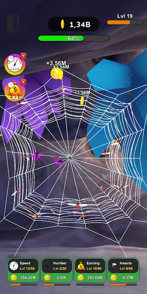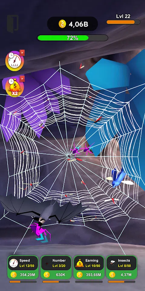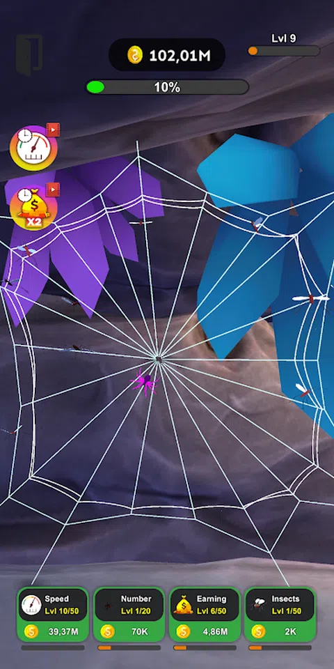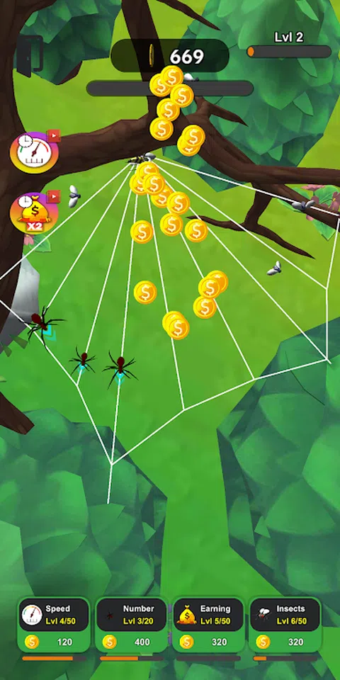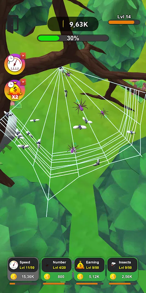 扮演酷炫的蜘蛛。帮助它们织网并捕捉有害昆虫。你的蜘蛛编织的网越多,它们能够捕捉的昆虫就越多,蜘蛛本身的进化速度就越快。 在 Spiders Evolution 中,将有可能创建整个蜘蛛群。为了发展你的殖民地并发现新的地点,你需要捕捉昆虫。捕获的每只昆虫都会带来硬币。用你收到的钱,你可以发展你的蜘蛛,让它们沿着进化的道路移动:提高它们的速度,捕捉昆虫赚取的硬币数量,或增加蜘蛛群的数量。 但是在 Spiders Evolution 中,你不仅可以通过捕捉昆虫来获得金钱。在我们的 3D 游戏中捕捉大型蜥蜴甚至鸟类,它们会带来更多金钱,并有助于加快蜘蛛的进化速度。另一种加快进度、捕捉更多昆虫并更快进化的方法是观看广告。对于广告,您可以提高速度,获得额外的蜘蛛和一堆不同的小工具,这将有助于捕捉更多昆虫并加速进化。 此外,在 Spiders Evolution 中,要让蜘蛛移动得更快,只需点击屏幕即可。玩我们的游戏,发现新的多彩地点,带领您的殖民地走向繁荣