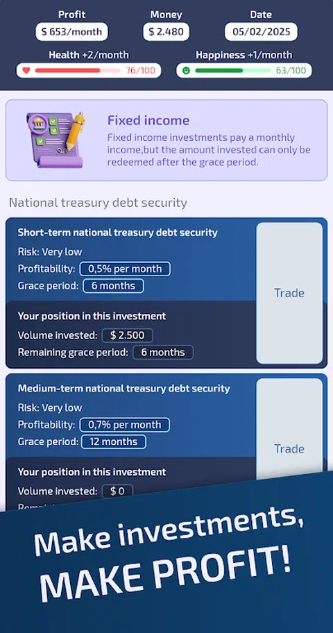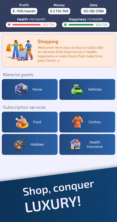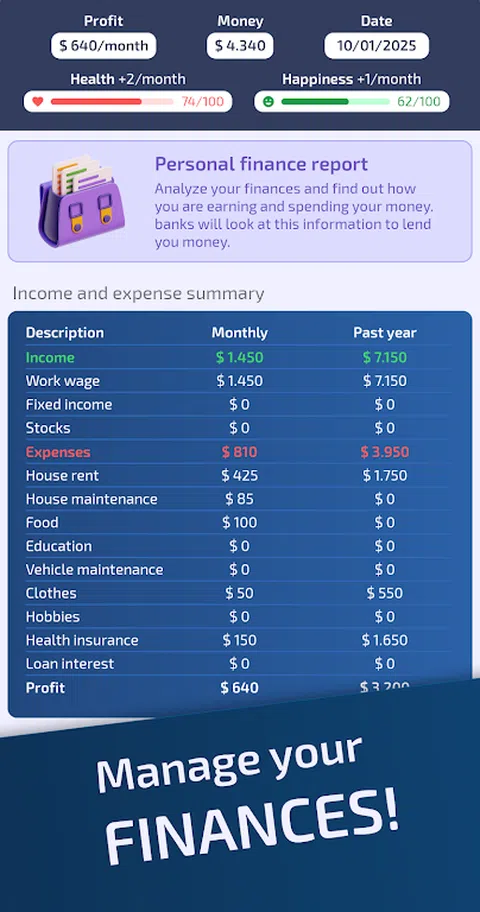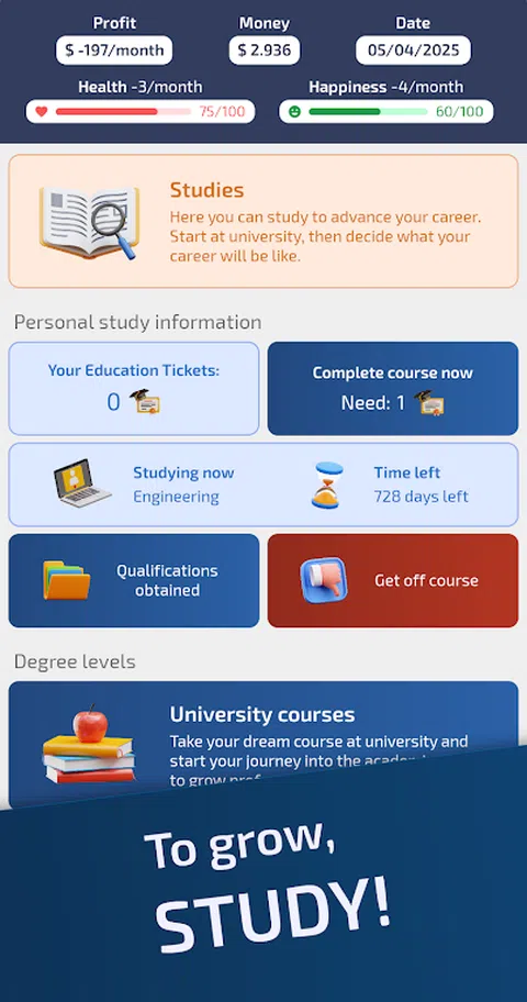 生活和商业模拟器 生活模拟器,专注于职业、商业、投资和明智的选择。 从一个没有钱的可怜男孩或女孩开始生活,然后进化!爬上企业界,赚钱并享受奢侈品。 您必须做出明智的选择才能成功! - 不断进步的职业:从实习生开始,攀登企业阶梯,您可以成为首席执行官,但您需要很多能力! - 教育:您必须努力学习才能达到世界顶峰!研究具有挑战性,但很有必要。 - 管理您的财务:投资国债,节省部分工资,让这笔钱以最佳方式获得回报